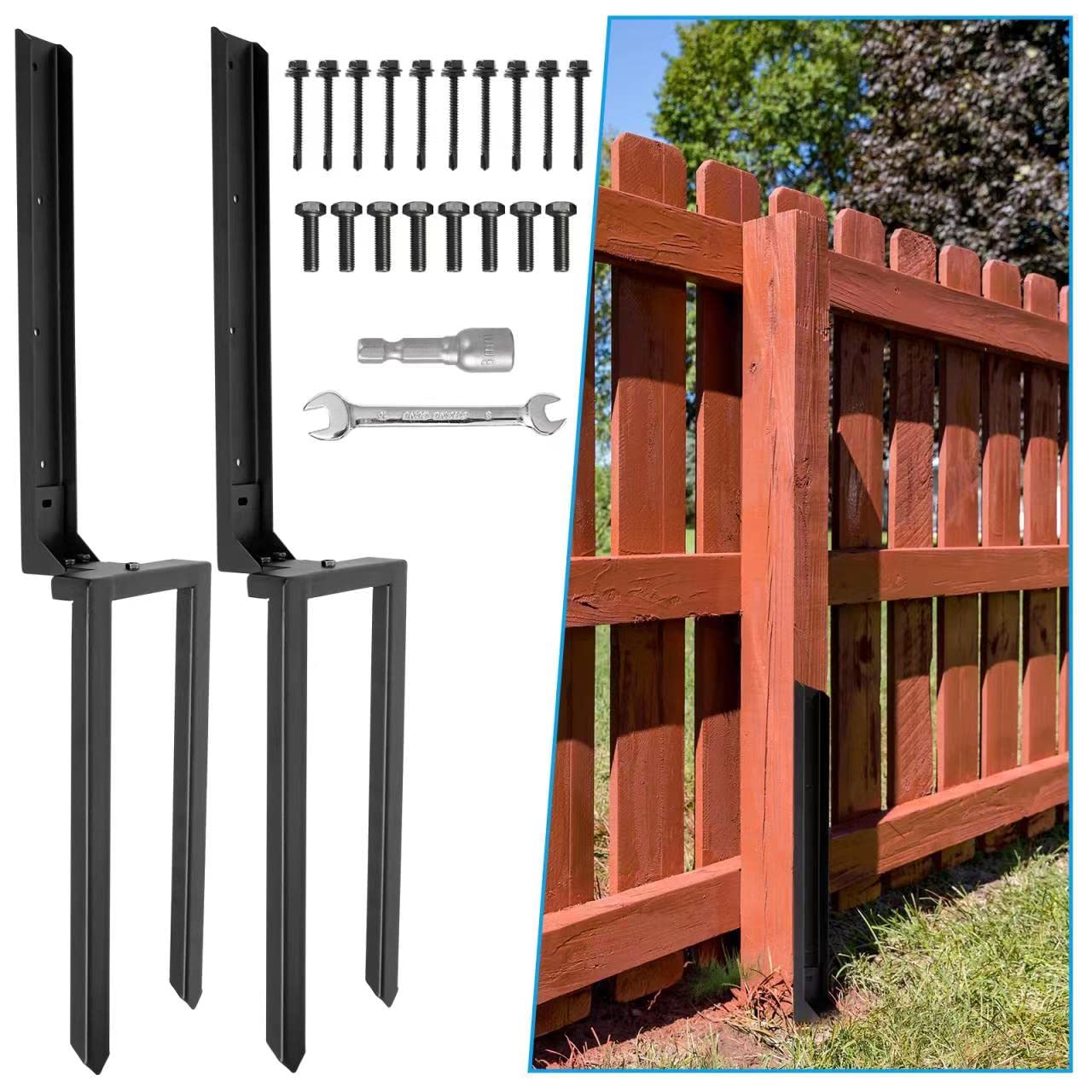 Nrspp Heavy Duty Steel Fence Post Repair Stakes, 2 Pcs Fence Post Anchor Double Ground Spike for Repair Tilted/Broken Wood Fence Post