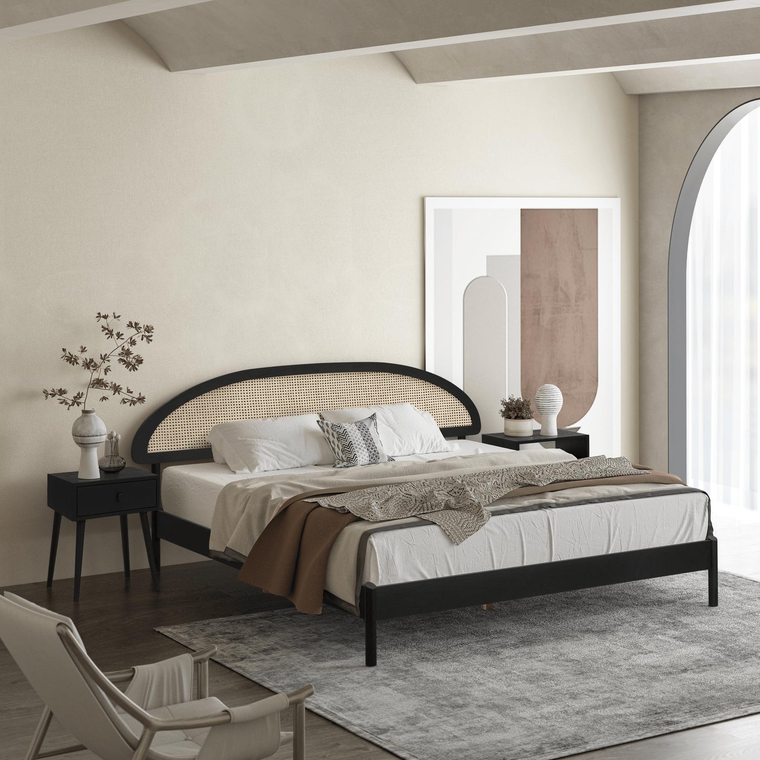 NTC Gem Wooden Bed Frame with Headboard and Natural Rattan, Solid Oak Foundation with Silent Slats, 1000 Lb Capacity, Effortless Assembly, King - Burnt Black