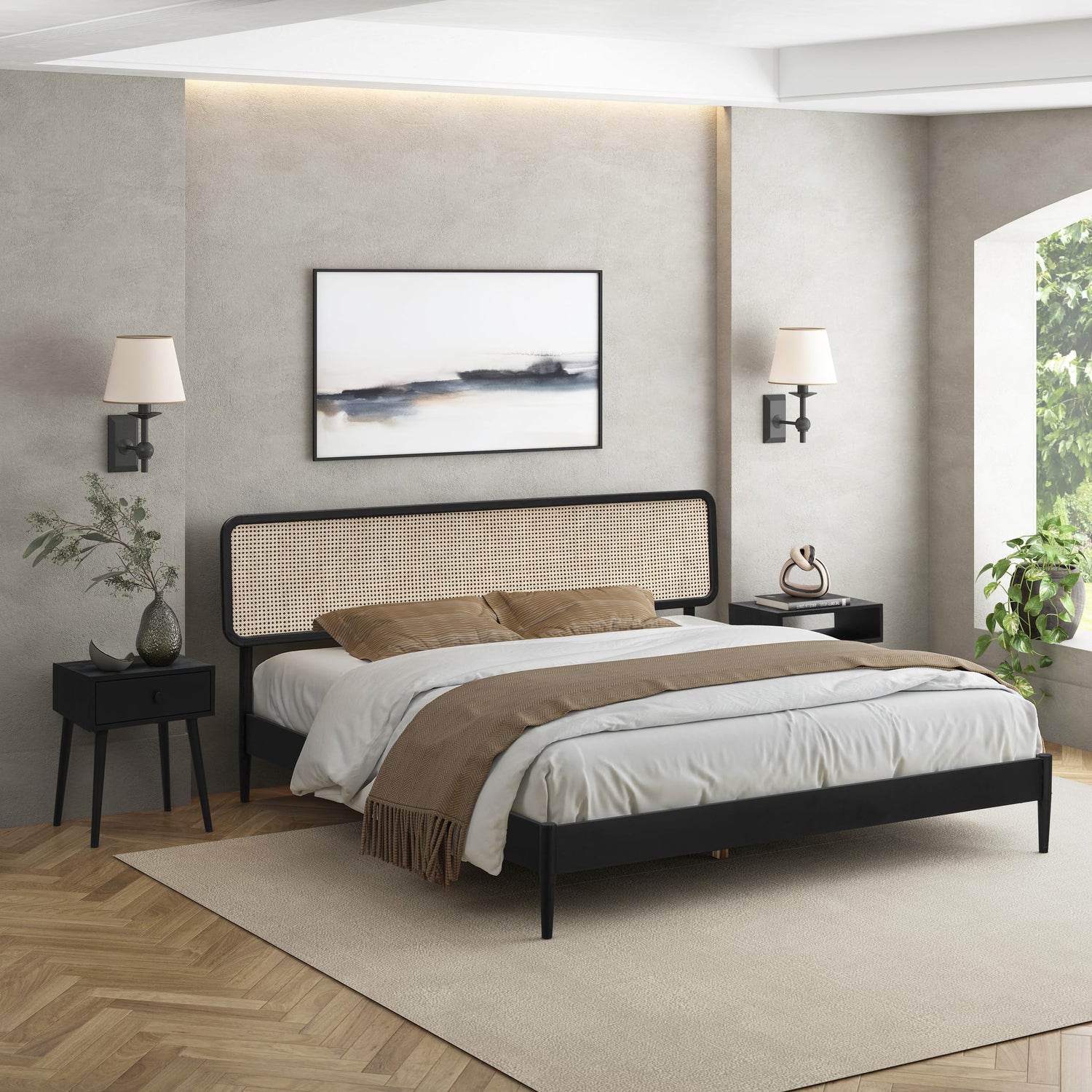 NTC Lupin Wooden Bed Frame with Headboard and Natural Rattan, Solid Oak Foundation with Silent Slats, 1000 Lb Capacity, Effortless Assembly, King - Burnt Black