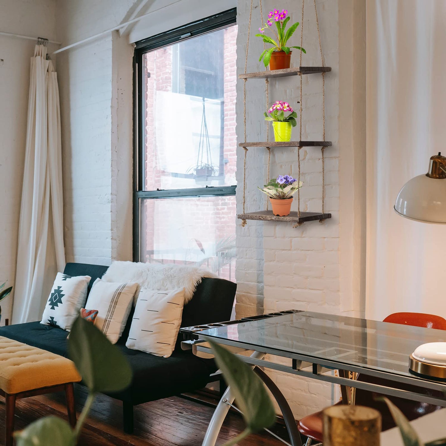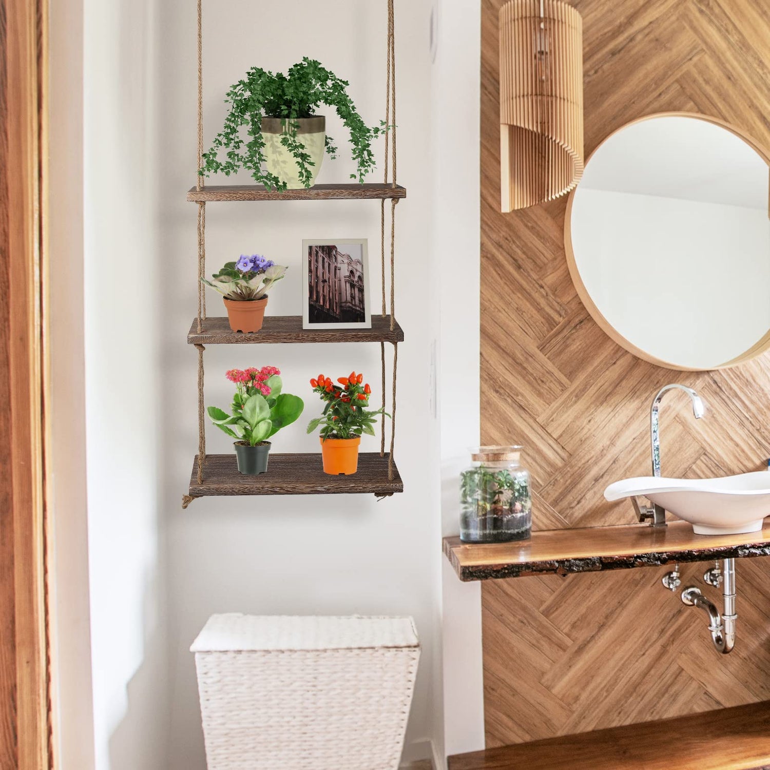 - Versatile Functions: the 3 tiered hanging shelves are pleasant pieces for most rustic, country, modern, farmhouse or natural home wall decors; Being hung with rope, they have different and rustic charms; They are allowed to better organize space and to put all sorts of things on display; They are nice choices for adding additional shelving space for books, collectibles, plants, crafts, photos and more