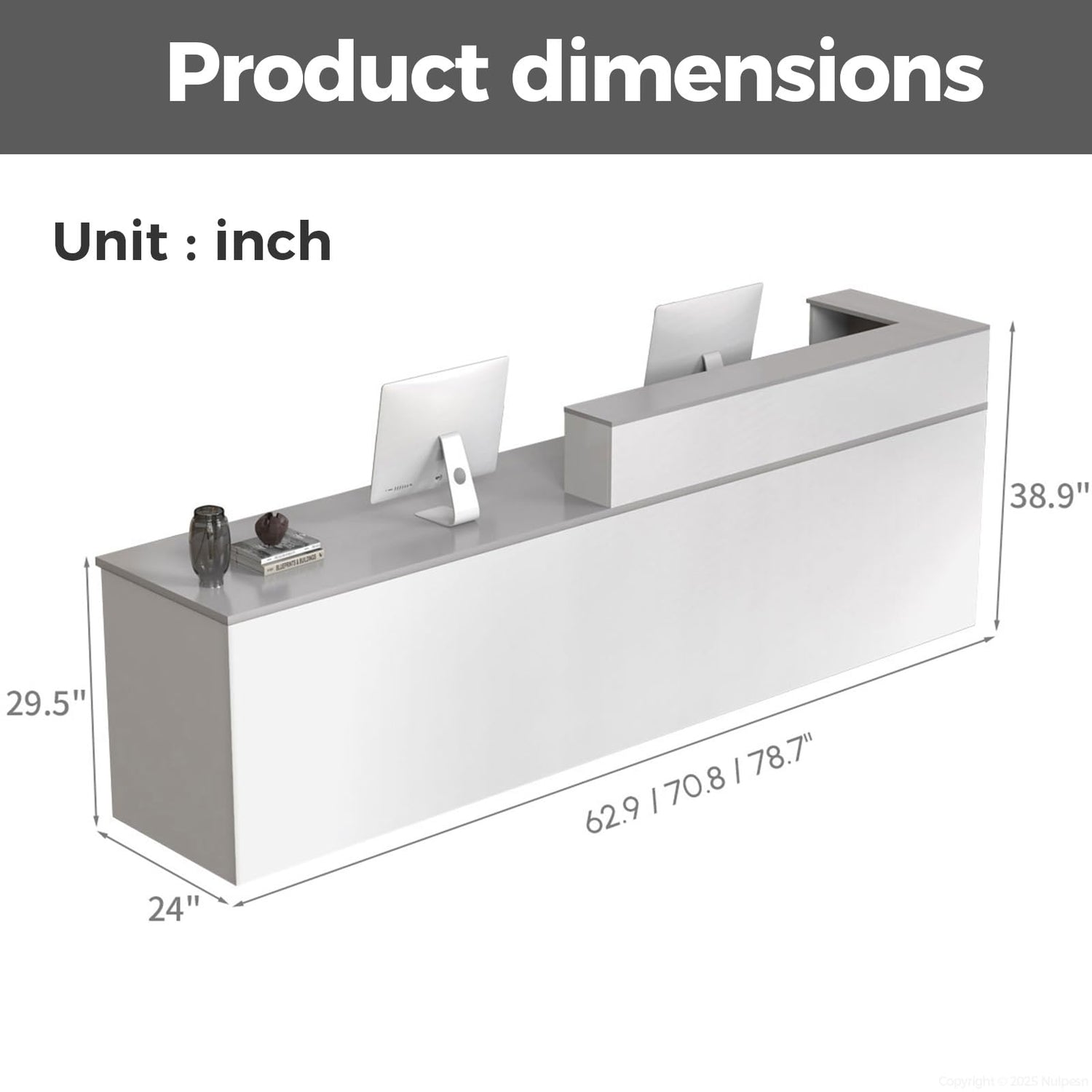 Nuipesn L Shape Reception Desk with Counter, Modern Front Desk Reception Counter with Keyboard Tray, Lockable Drawer and Storage Shelves for Office, Retail, Salon(White+Gray/Left, 63" L*24" W*39" H)