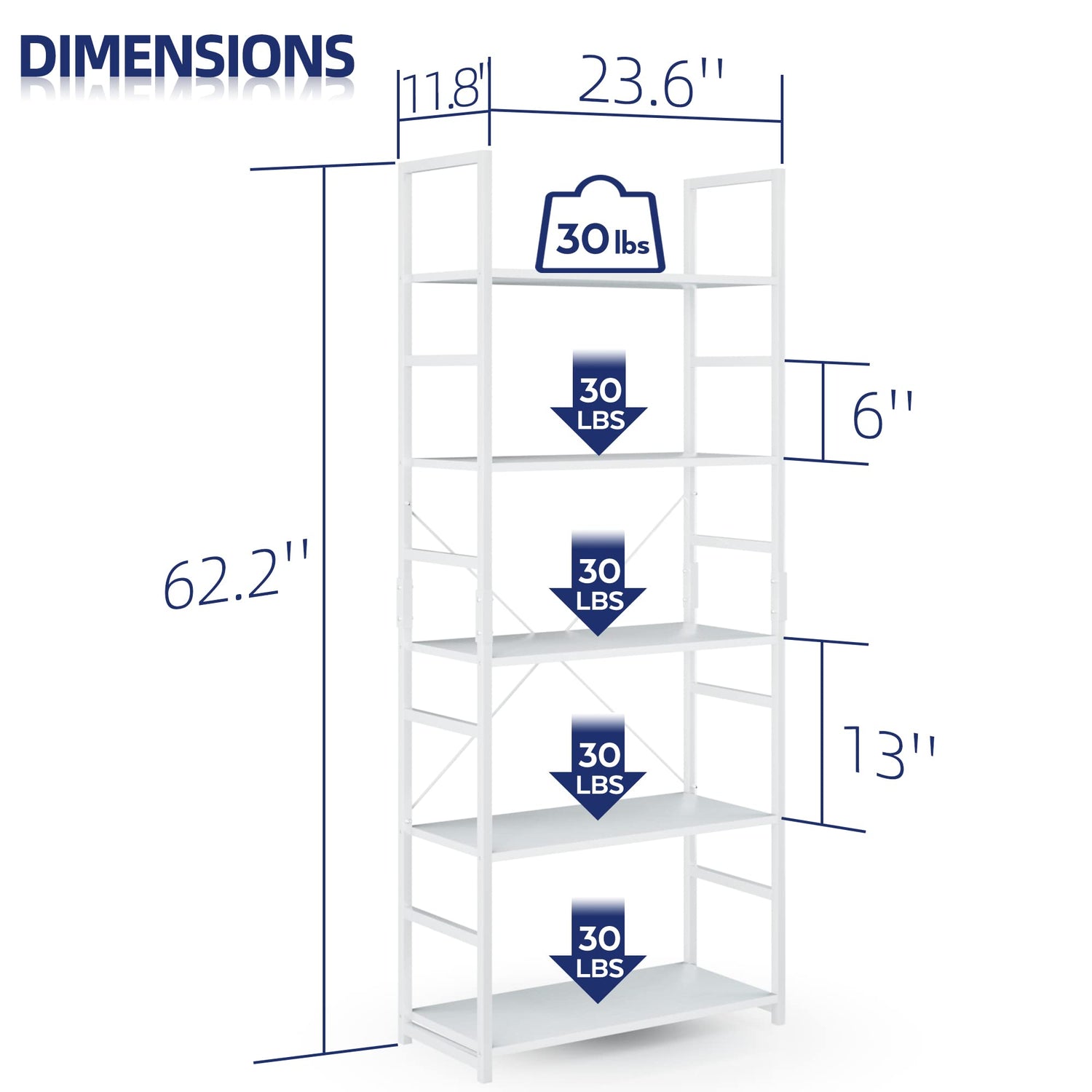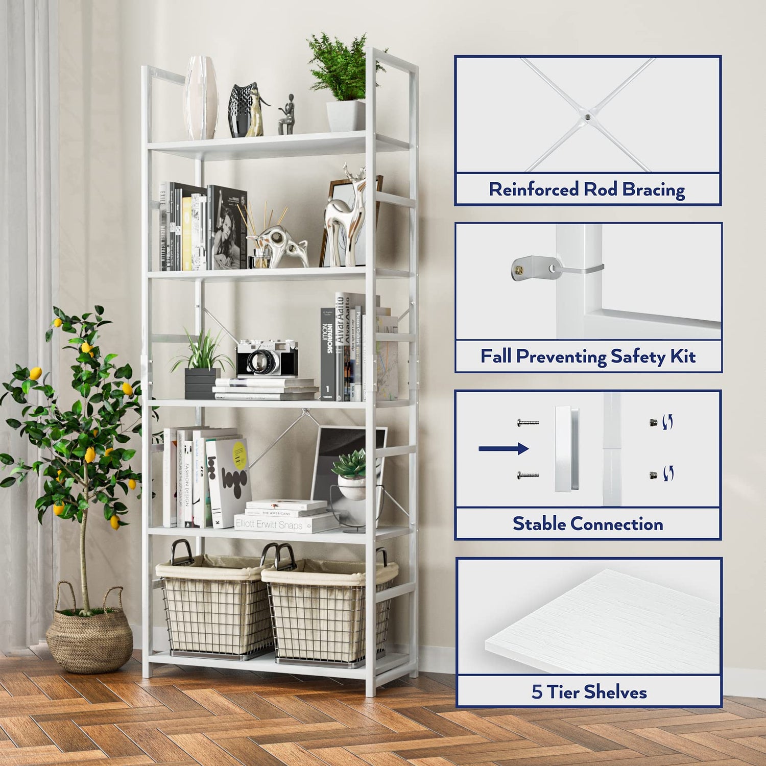 NUMENN 5 Tier Bookshelf, Tall Bookcase Shelf Storage Organizer, Modern Book Shelf for Bedroom, Living Room and Home Office, White