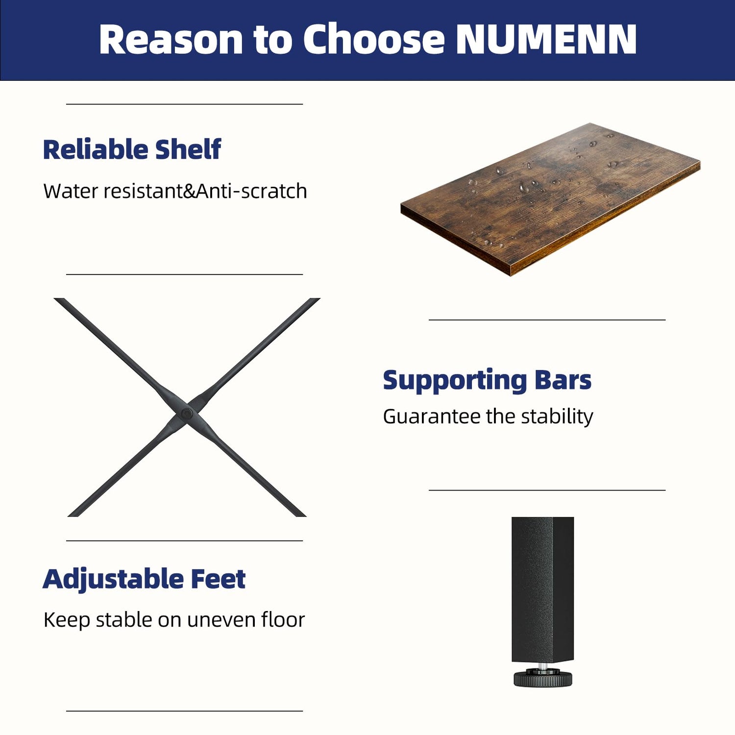 Crafted from premium metal and selected particle board, the NUMENN bookshelf offers impressive stability and longevity. The anti-rust coating not only guarantees a refined appearance but also ensures durability. With waterproof and scratch-proof surfaces, maintaining this bookshelf is effortless—just wipe it clean with a damp cloth. Each shelf can support up to 70 lbs, making it a robust solution for all your storage needs.