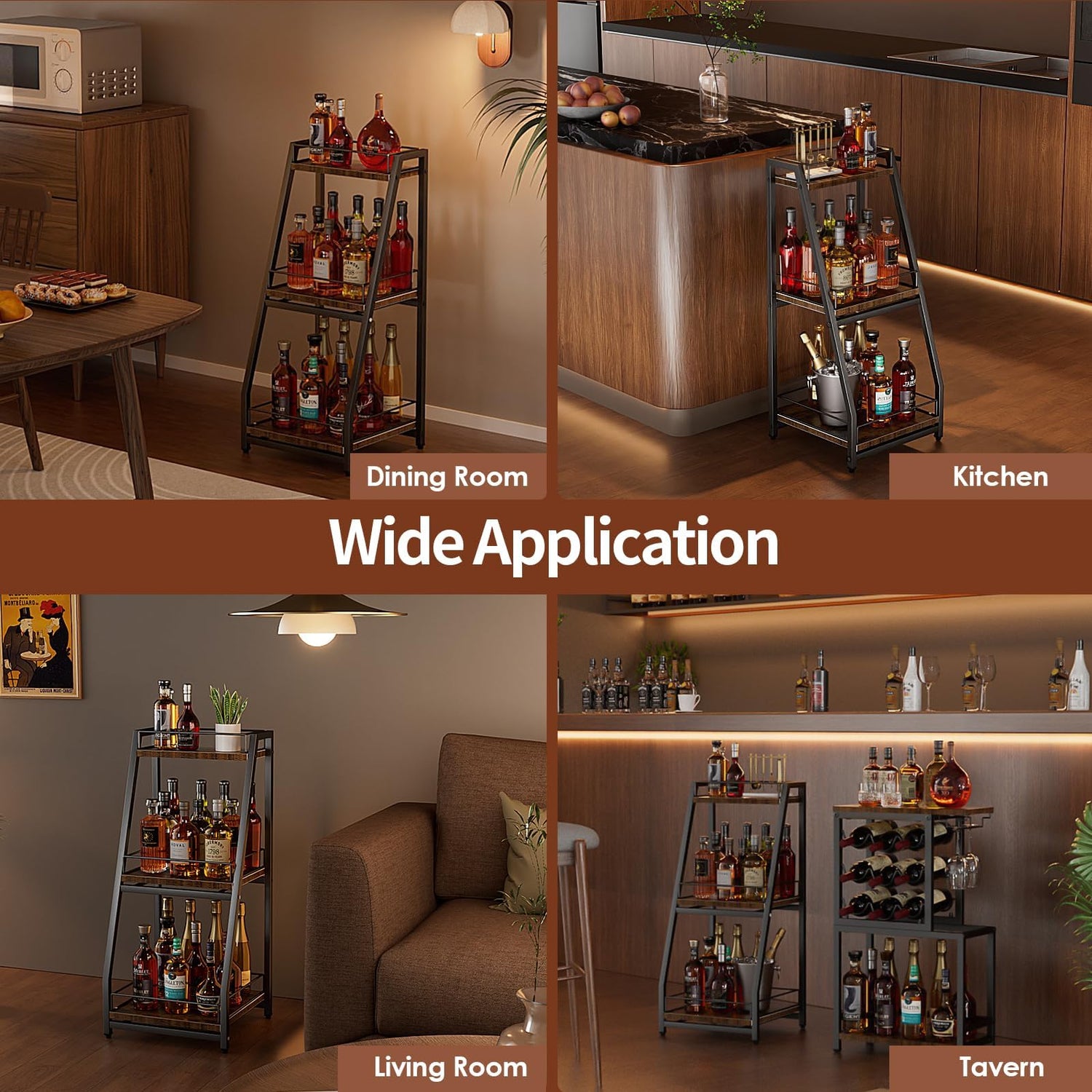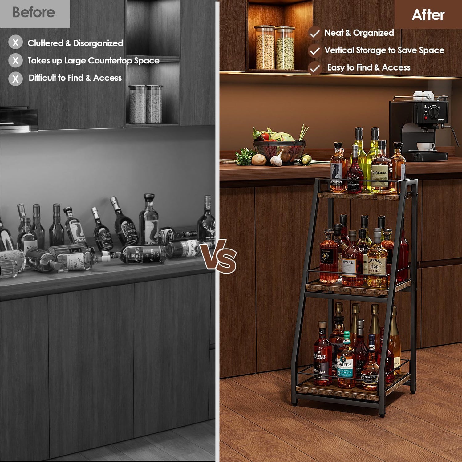 - Versatile Usage: 3-tier liquor stand floor is suitable for multiple occasions such as kitchen, living room, dining room, bar, wine cellar, coffee bar and so on. It can be used to organize not only liquors like whiskey, wine, and red wine, but also syrups, spice jars, salad dressings, olive oil, and other bottled items.
