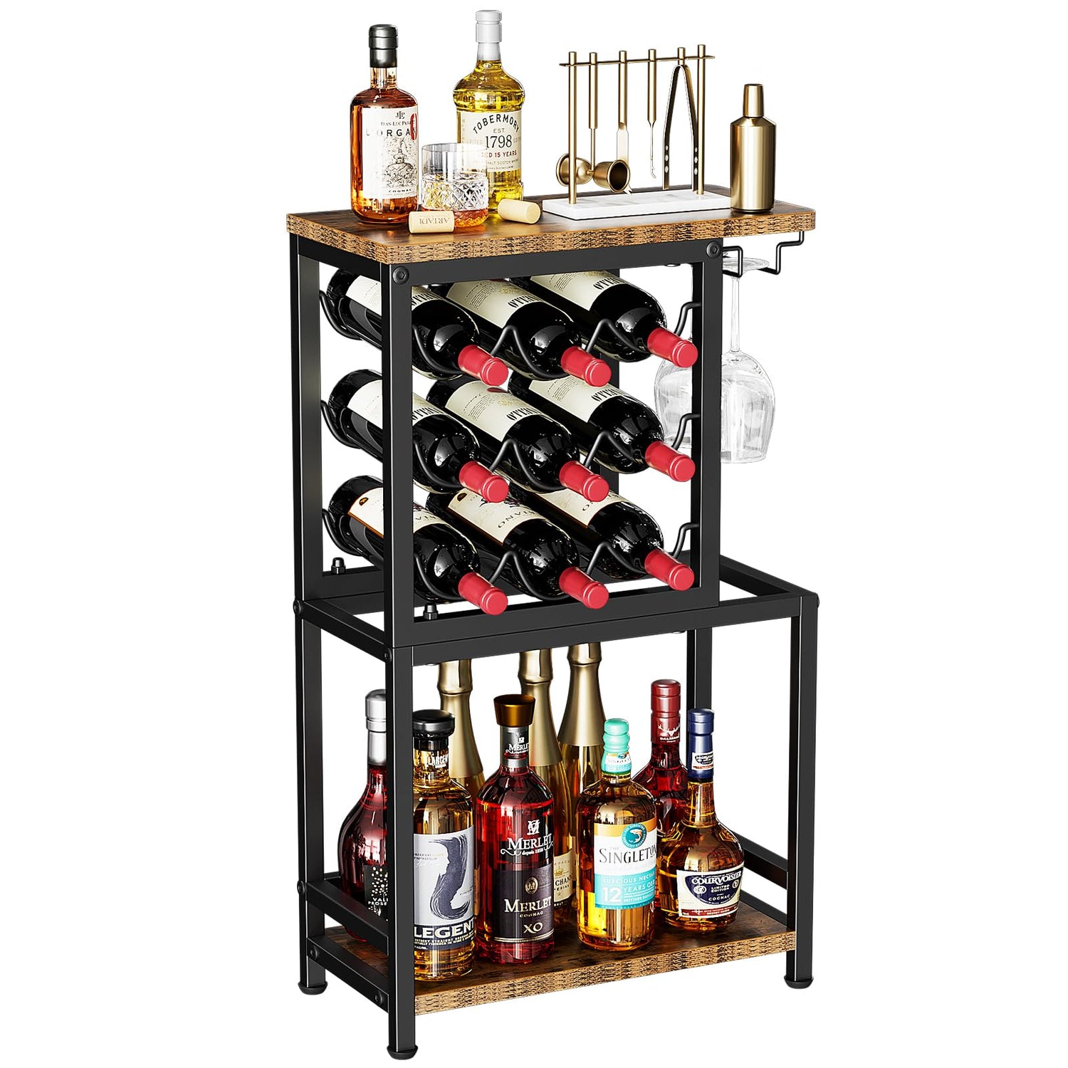 - All-in-one Design: This liquor stand for home bar will fulfill your various storage needs. The top tier is perfect for holding frequently used wine glasses, mixers, fruit and more. The middle tier consists of 3 rows of wine racks for 9 bottles and a glass racks for 2 glasses. Moreover, the bottom floor can hold larger capacity bottles and stemware, such as champagne and whiskey.