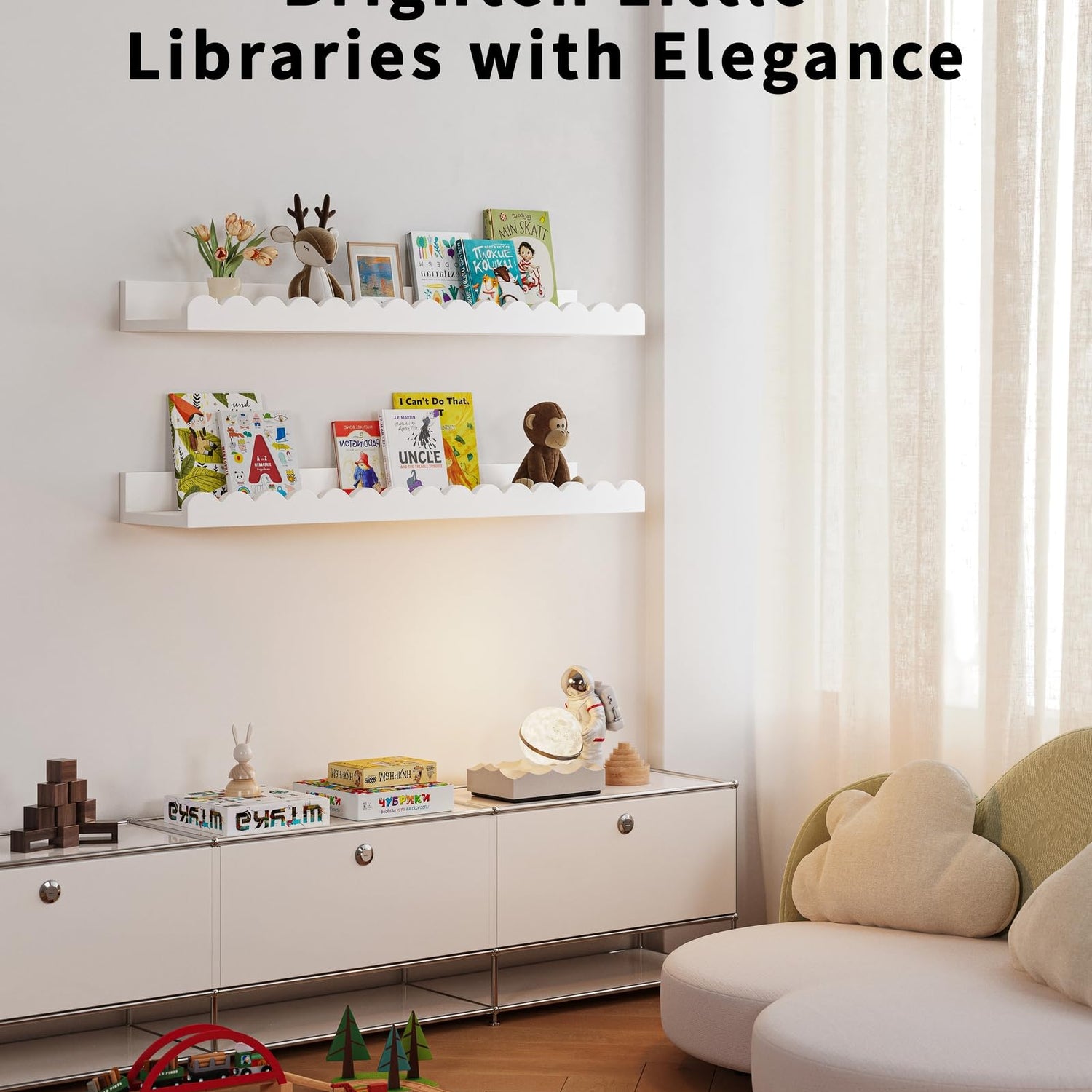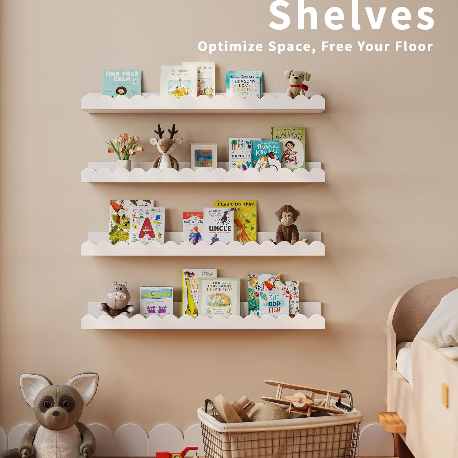 Nursery Book Shelves, 4-Pack White Floating Shelves for Wall Kids, Scalloped Shelves, Wall Book Shelves for Bedroom Kids, Toddler Room, Baby Room, Nursery Decor