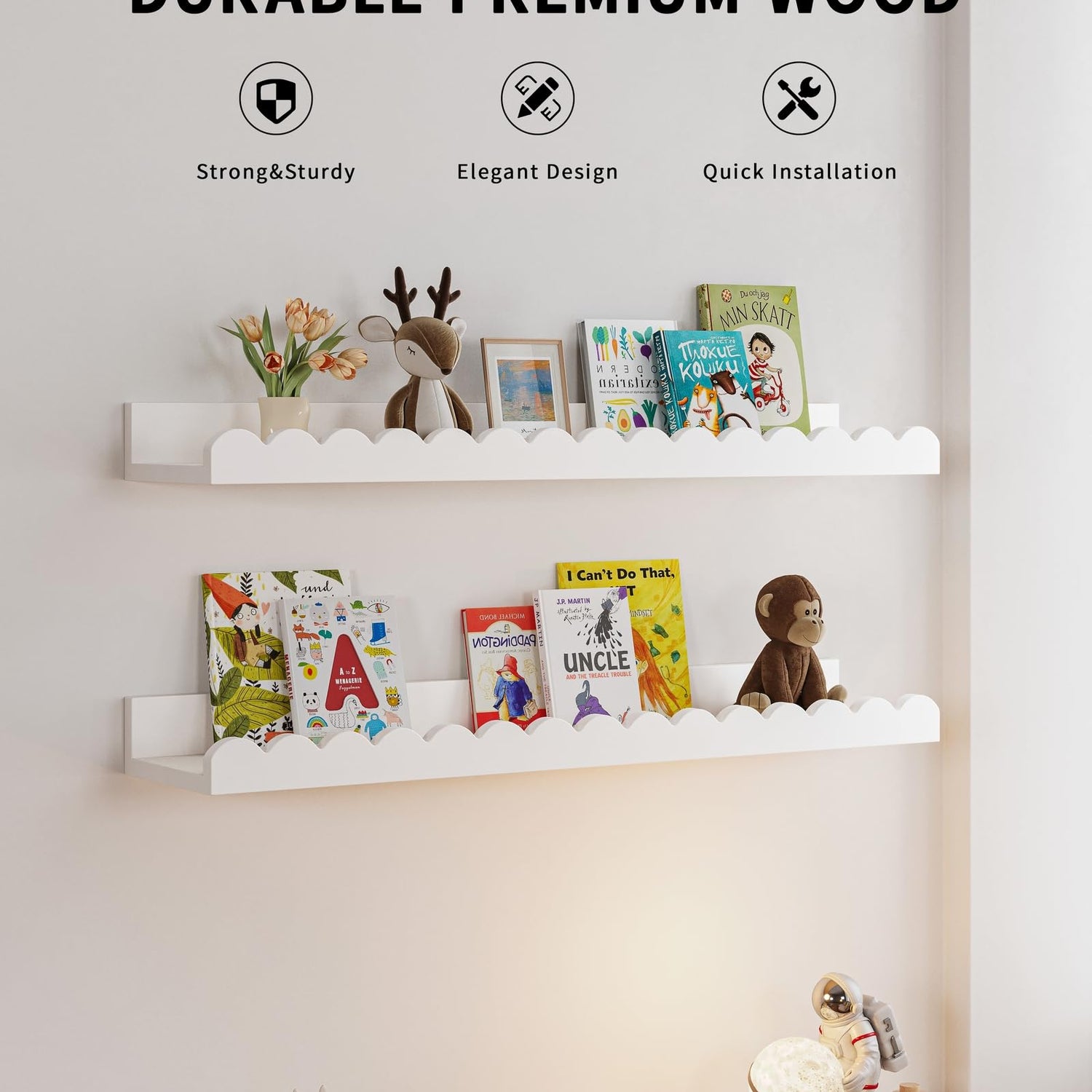 • High-Quality Wood: Crafted from premium hardwood, our wall-mounted bookshelf ensures durability and a long-lasting finish, making it a reliable addition to any child's room