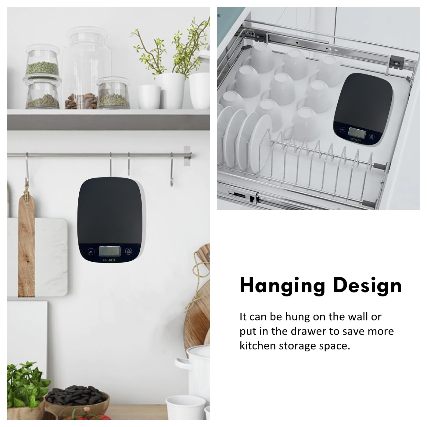 - Sleek and stylish, this modern scale adds a fashionable touch to your kitchen. Its slim design hangs effortlessly for decoration or stores neatly in any cabinet, saving space.
