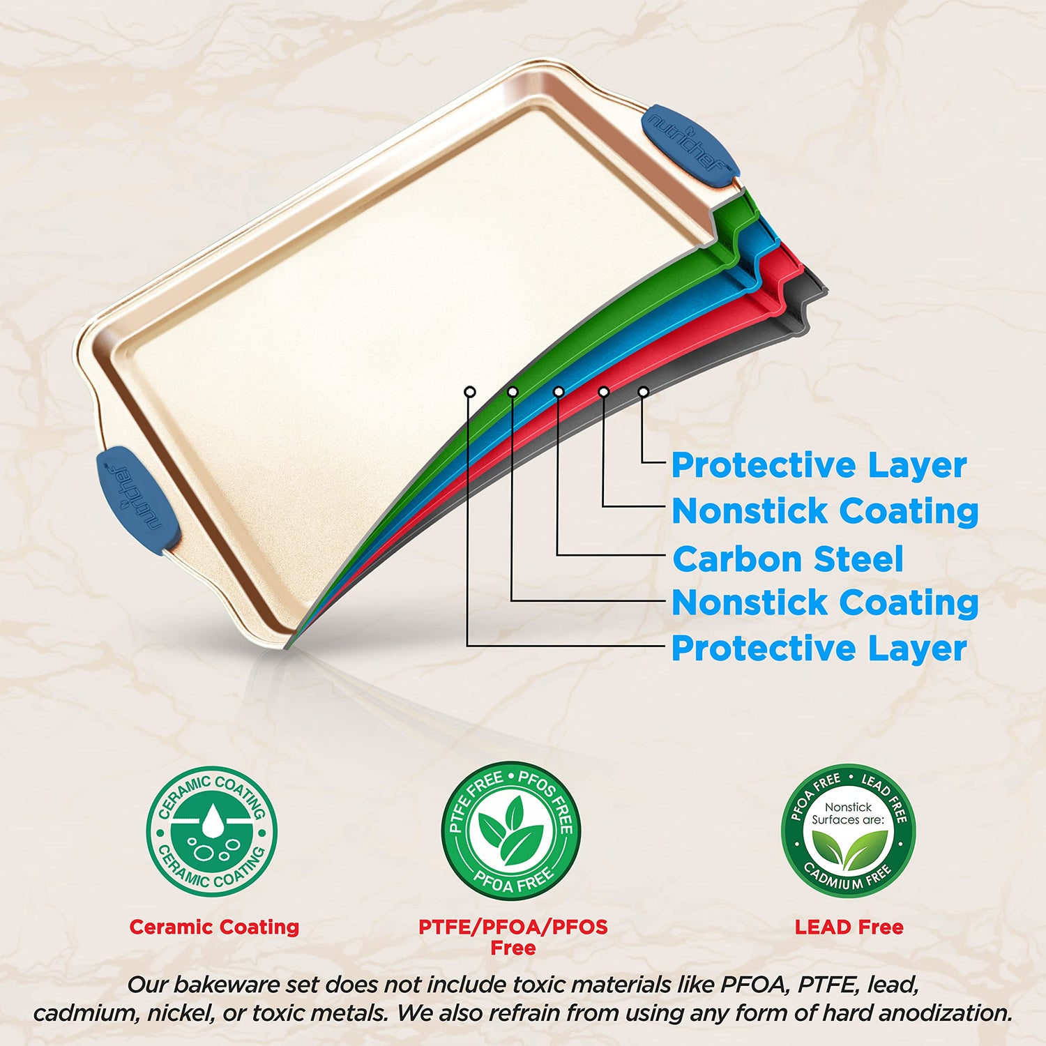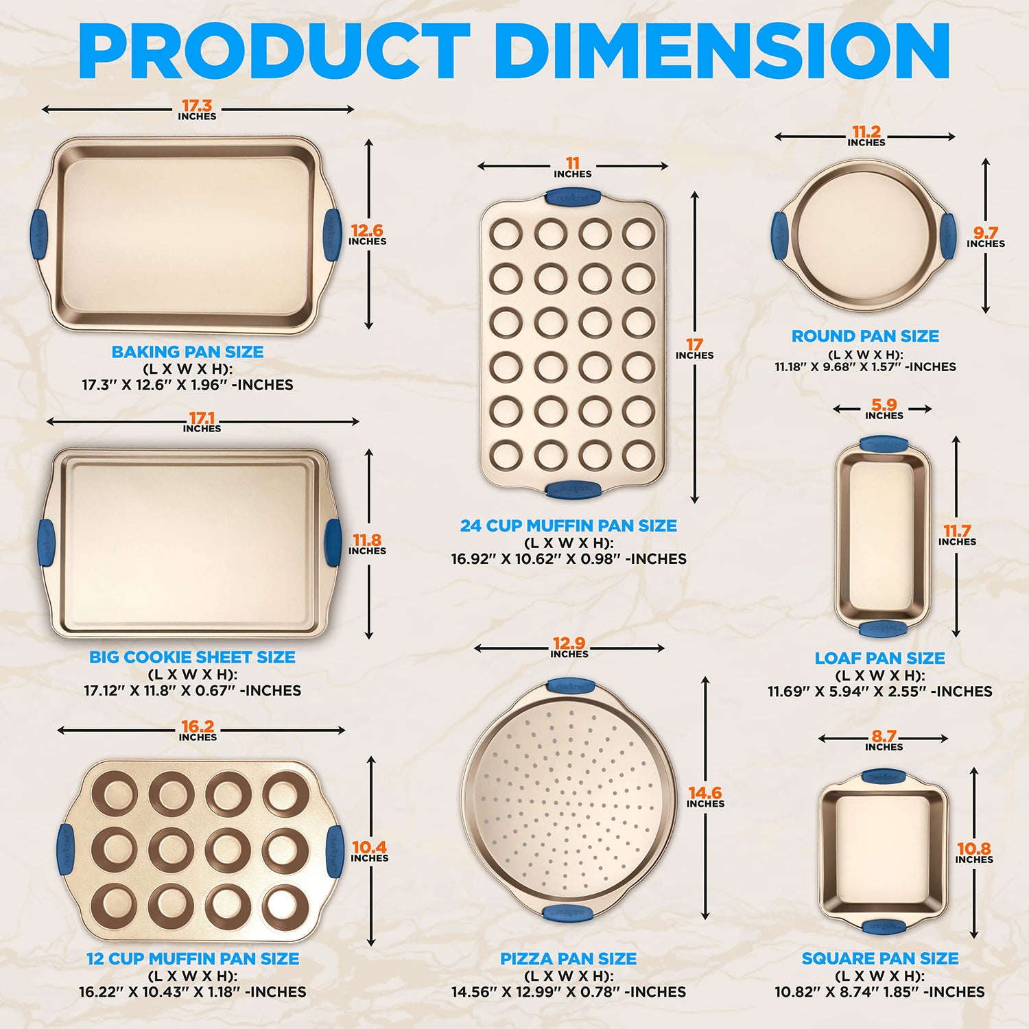 Details: Features: - Flexible & Nonstick Carbon Steel Bakeware Set With Blue Silicone Handles - Professional Home Kitchen Bake Pan Set - Commercial Grade Restaurant Quality Metal Bakeware - Durable & Reliable Cookie Sheet Oven Pan Style - Attractive, Stylish Non-Stick Gold Silicone Coating - Dishwasher Safe - Recommended for Hand-wash Only - Long-Lasting, Stain-Resistant & Easy-to-Clean - Space-Saving Stackable Wide Tray Pan Design - Ideal for Baking a Number of Astonishing Baked Goods - Metal, Reusable, Quality Kitchenware For Cooking & Baking Cake Loaf, Muffins & More - Suitable for Oven, Refrigerator, and Freezer - PFOA, PFOS, PTFE Free What’s In The Box: - (1) Baking Pan - (1) Pizza Pan - (1) Small Cookie Sheet - (2) Round Pan - (1) Square Pan - (1) Loaf Pan - (1) Big Cookie Sheet - (1) 12 Cup Muffin Pan - (1) 24 Cup Muffin Pan Technical Specs: - Temperature Resistance: Up to 446° Fahrenheit (230° Celsius) - Construction Material: Carbon Steel - Metal Tray Thickness: 0.4mm - Baking Pan Size (L x W x H): 17.32'' x 12.6'' x 1.96'' -inches - Pizza Pan Size (L x W x H): 14.56'' x 12.99'' x 0.78'' -inches - Small Cookie Sheet Size (L x W x H): 15.15'' x 10'' x 0.59'' -inches - Round Pan Size (L x W x H): 11.18'' x 9.68'' x 1.57'' -inches - Square Pan Size (L x W x H): 10.82'' x 8.74'' 1.85'' -inches - Loaf Pan Size (L x W x H): 11.69'' x 5.94'' x 2.55'' -inches - Big Cookie Sheet Size (L x W x H): 17.12'' x 11.8'' x 0.67'' -inches - 12 Cup Muffin Pan Size (L x W x H): 16.22'' x 10.43'' x 1.18'' -inches - 24 Cup Muffin Pan Size (L x W x H): 16.92'' x 10.62'' x 0.98'' -inches