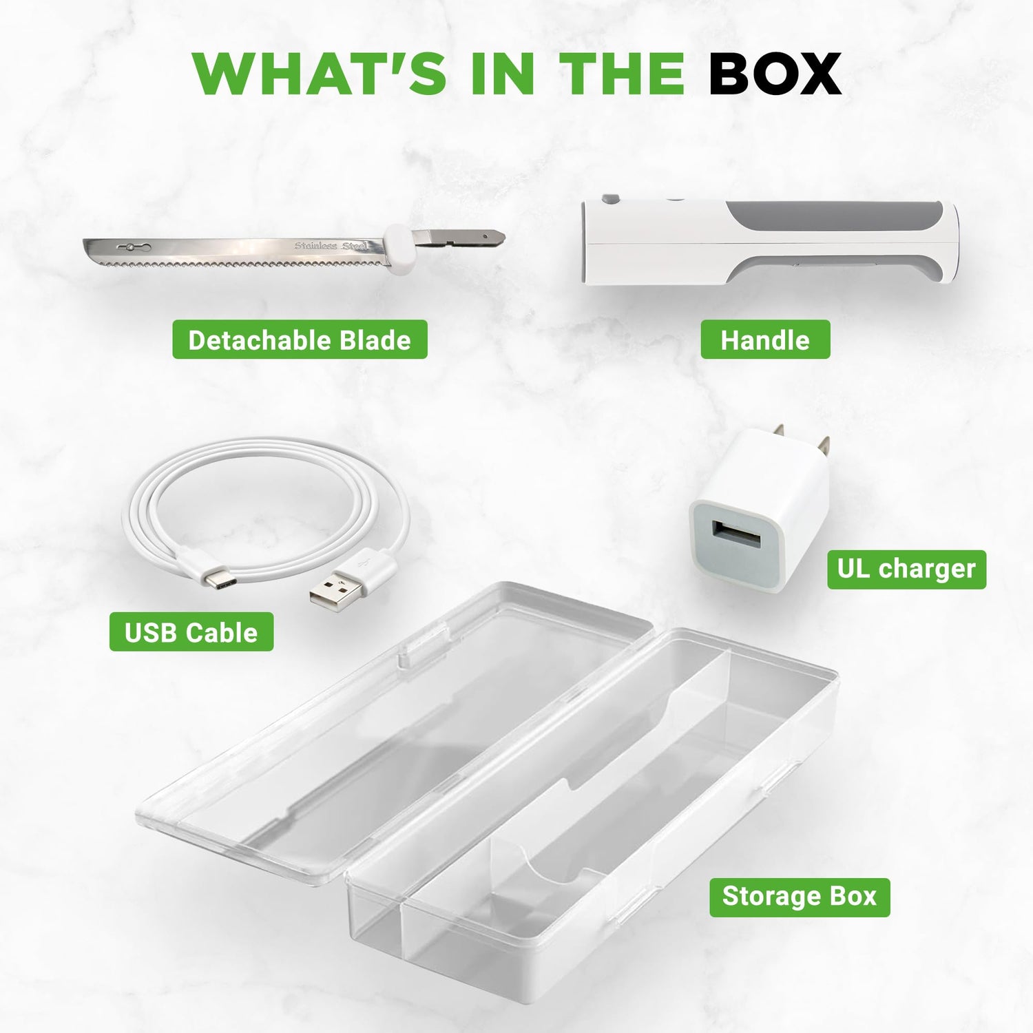 - ALL-INCLUSIVE PACKAGE - The package includes the essential components: electric knife handle, stainless steel knife, USB cable, and UL charger. The Type-C USB cable provides fast and reliable charging. Charge time is 3 hours.