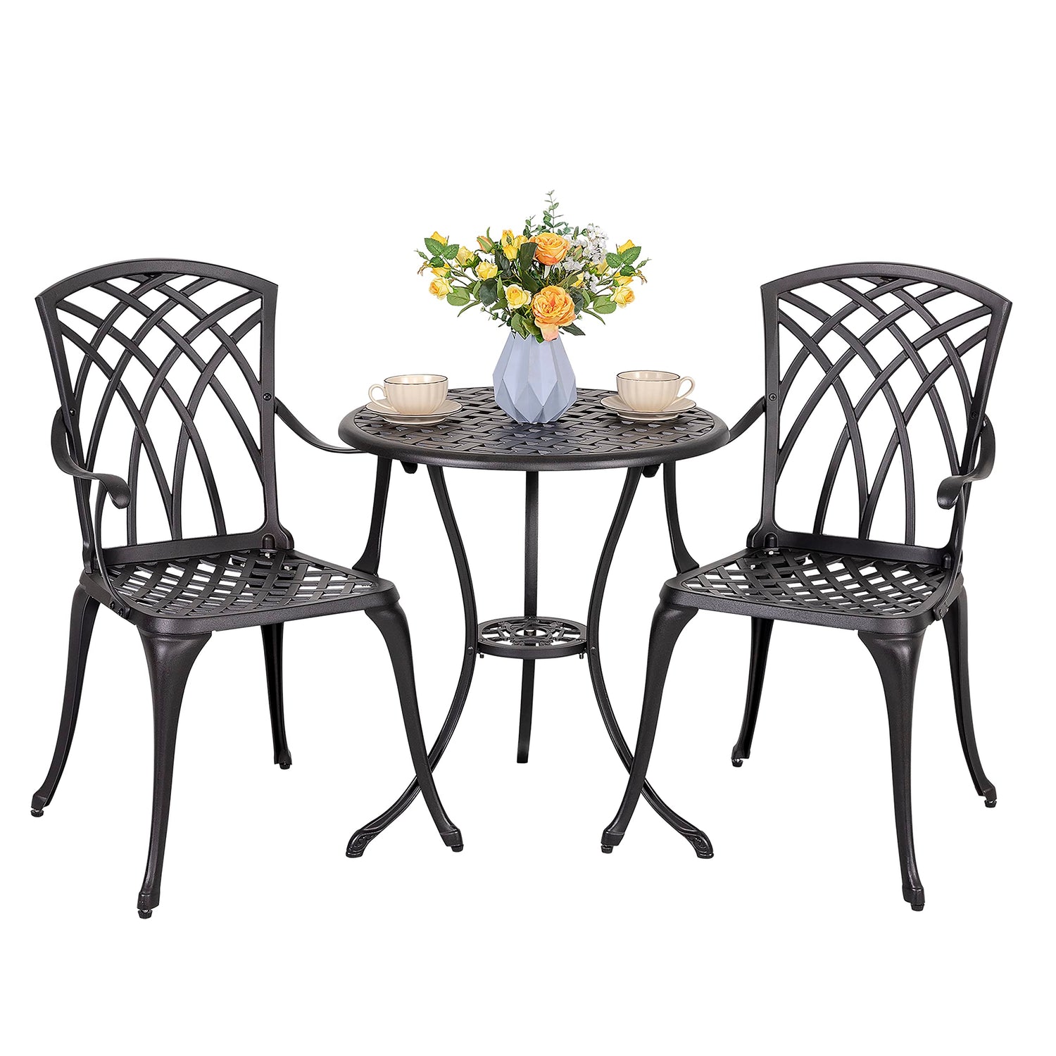 Details: Feature: Simplicity and elegance make this 3-piece bistro set perfect for any outdoor and indoor setting. Take a seat and enjoy an afternoon tea on the front porch or a conversation with a friend in your own backyard. Exceptionally crafted from cast aluminum with a unique design and an antique bronze finish, it boasts a vintage look fit for any home. Specification: [ Including] 1 x aluminum round table, 2 x aluminum bistro arm chairs; Product Dimension: 23.62" L x 23.62" W x 26.37" H (Table), 20.87" L x 20.5" W x 35.5" H (Chair). [ Quality materials Solid Construction for Long-term Use ] Constructed with cast iron & aluminum, this outdoor bistro table set is solid and durable. The cast aluminum construction gives you the peace of mind of zero maintenance, either dry or wet cloth can be used to clean. We use stainless steel screws which ensure it will not rust in rain. Perfect for your balcony, as well as your porch, pool side, and also for indoor use, creating new look and feel. [ Thoughtful Design for your Comfort Use ] The 1.60-inch umbrella hole in the center of the table can fit a patio umbrella (not included) for convenient shade and cool relaxation; [ Upgraded Stability ] This Nuu Garden bistro set is more heavier than other sellers on Amazon, that means it will add the stability and doesn't blow away in the wind. It is not very lightweight in the market, but you could pick it up. [ Easy Instruction Work ] With detailed assembly manual and complete accessories, it is easy to assemble the table and chairs well. Each part is numbered and all specific installation steps are listed for your reference.
