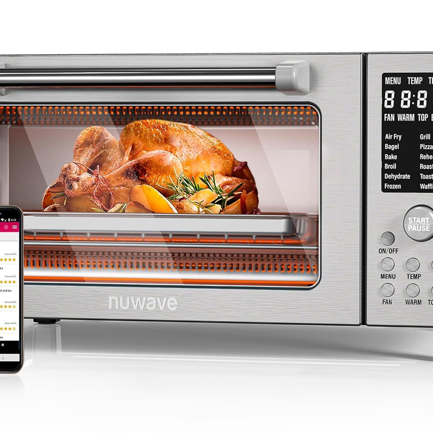 Nuwave Bravo Air Fryer Toaster Smart Oven, 12-in-1 Countertop Convection, 1800 Watts, 21-Qt Capacity, 50°-450°F Temp Controls, Top and Bottom Heater Adjustments 0%-100%, PFAS Free, Stainless Steel