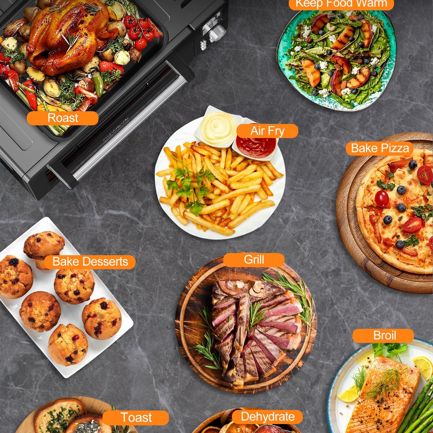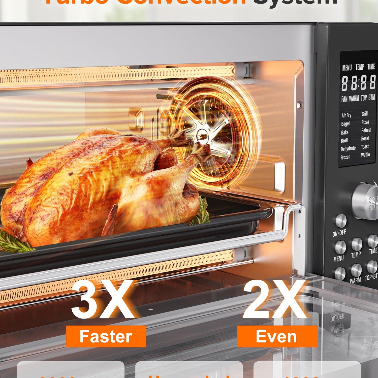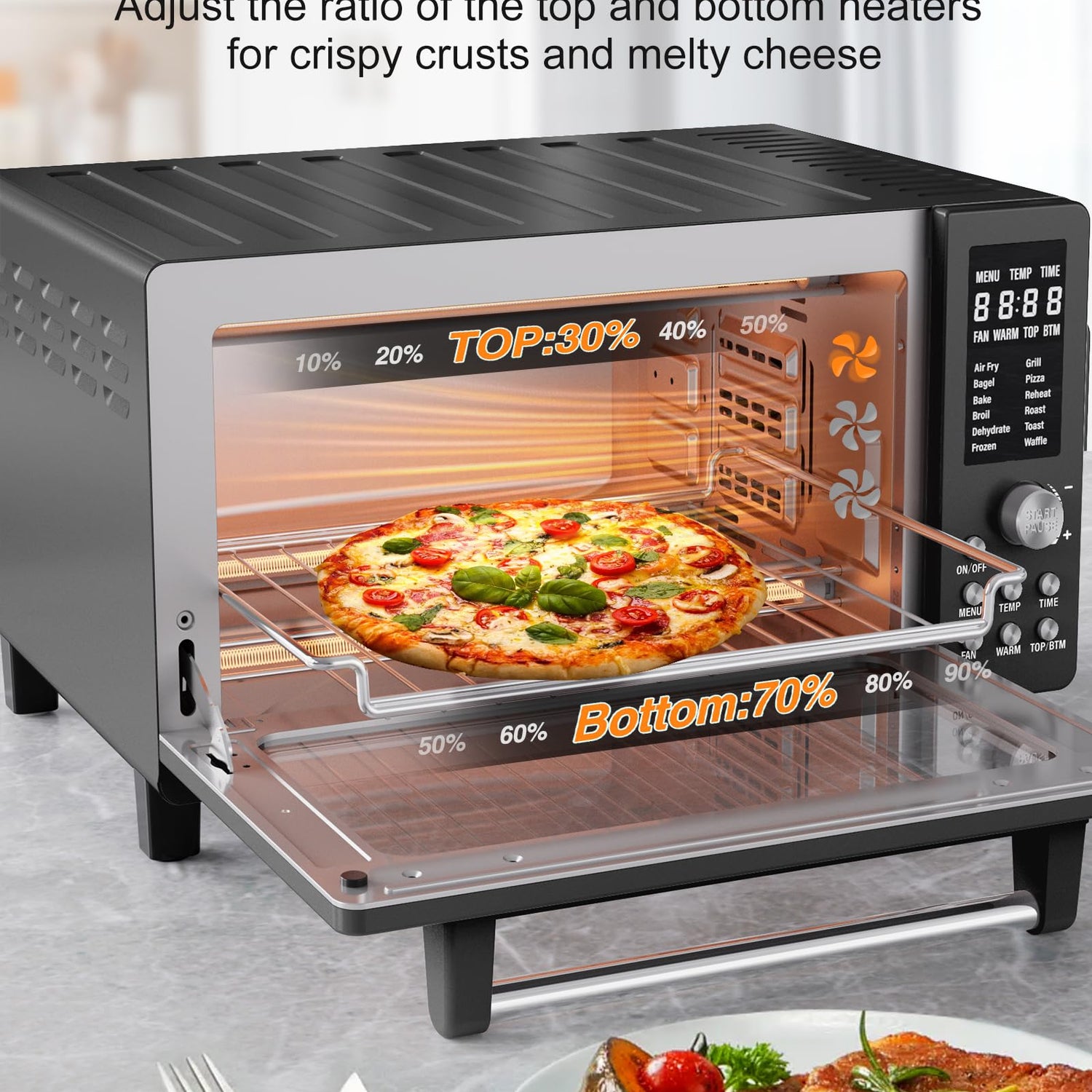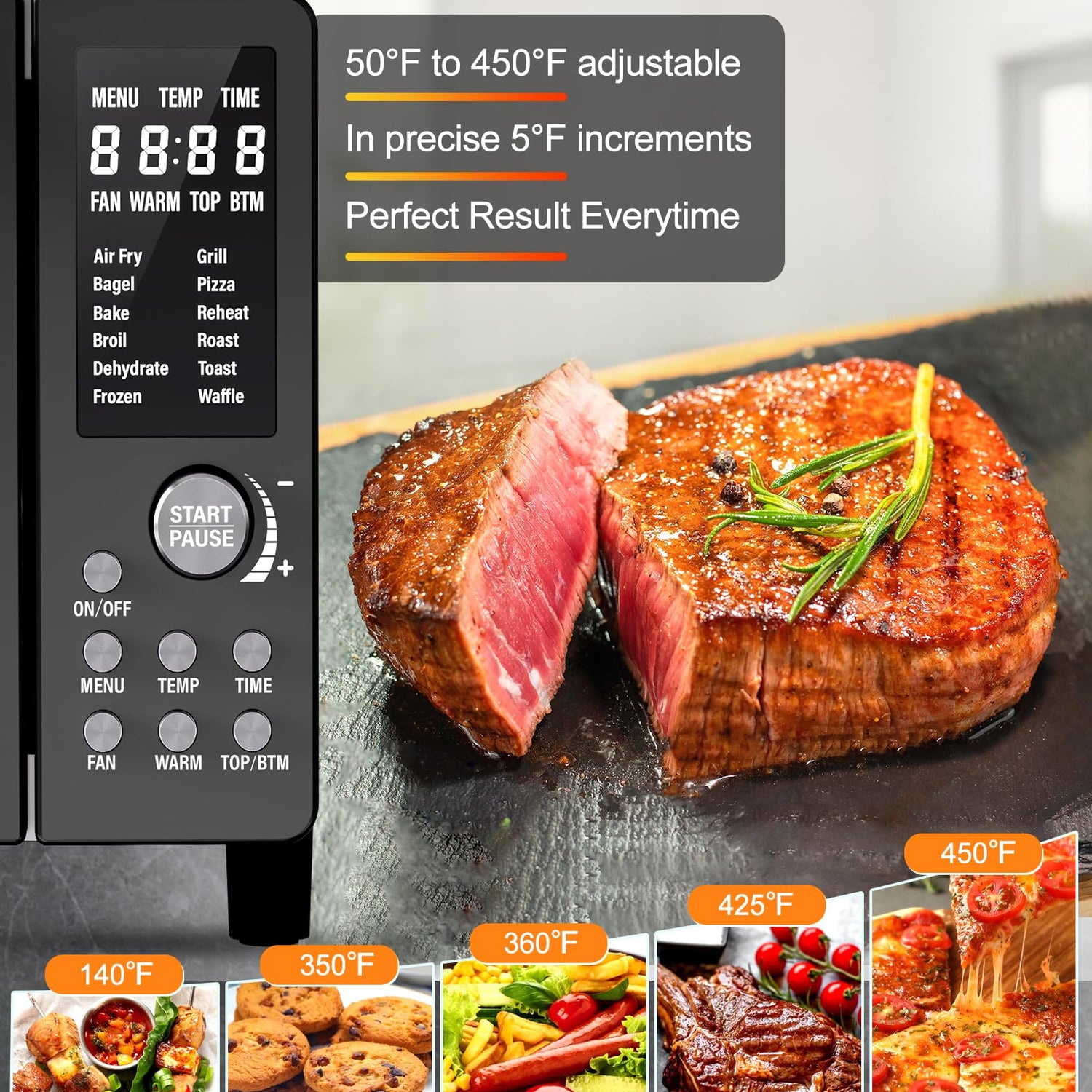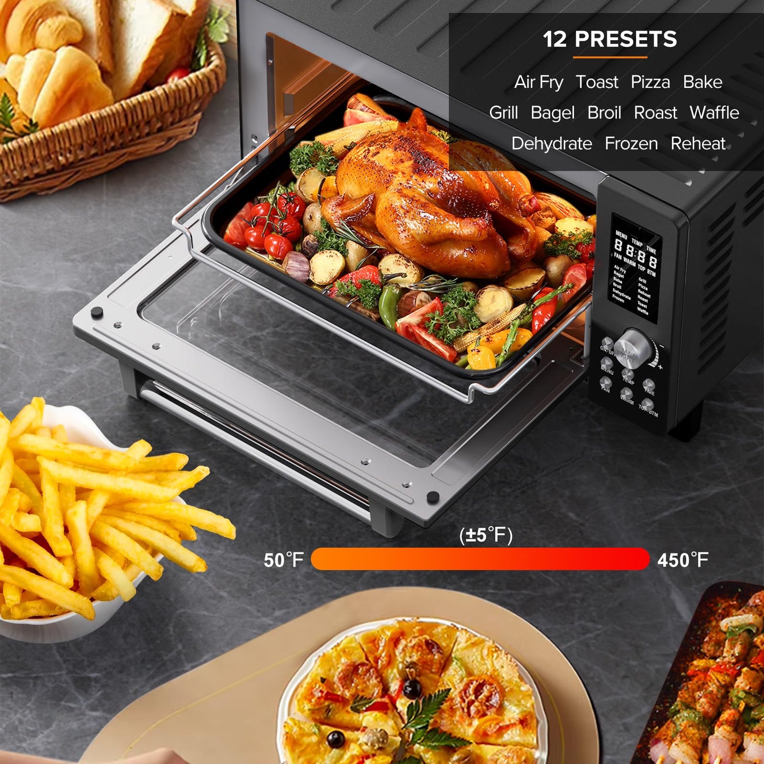 - 12 PRE-PROGRAMMED PRESETS - This premium 1800-watt toaster oven and air fryer features 12 functions: Air Fry, Grill, Bake, Reheat, Bagel, Pizza, Toast, Broil, Waffle, Dehydrate, Frozen and Keep Warm, all in one powerful appliance.