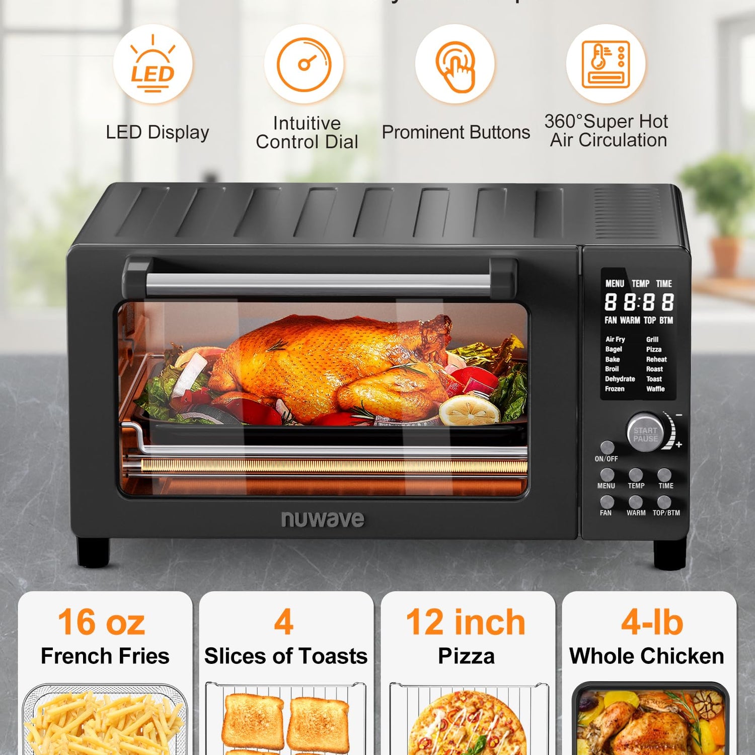 - 2X MORE EVEN: This Air Fryer Toaster Oven utilizes the latest 2024 upgraded Ultra-Fast Convection System, combined with top and bottom heating elements, virtually eliminating temperature variations even when cooking on multiple racks. Compared to other brands, Nuwave offers twice the uniformity and efficiency. Save you both time and energy.