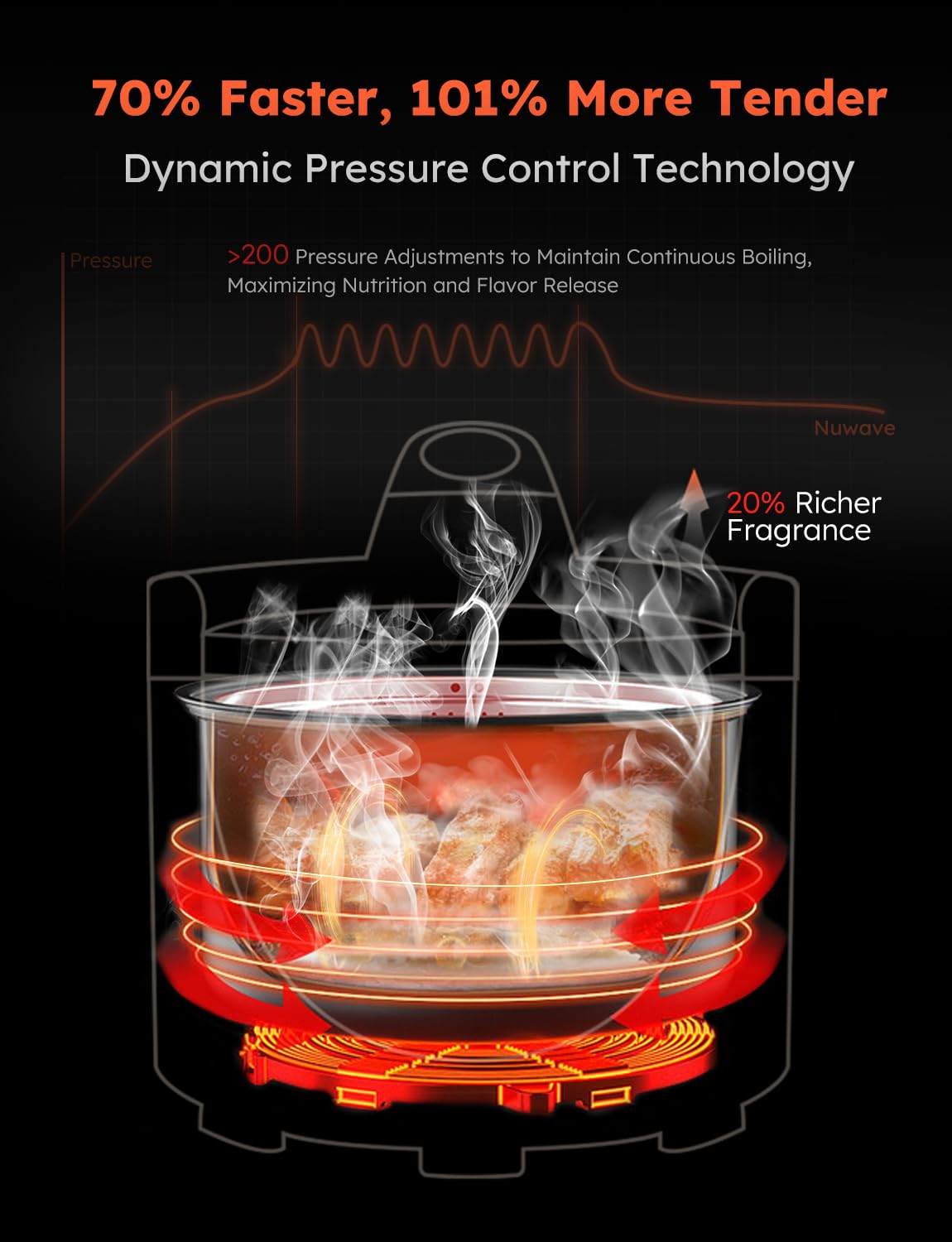 - 6 MINS TO A PERFECT DISH: NuWave electric pressure cooker employs Dynamic Pressure Control Technology, maxmaking 200 pressure adjustments to maintain continuous boiling, thus maximizing nutrition and 20% tastier flavor release. With 80kPa max pressure, cooking speed is 70% faster than others.