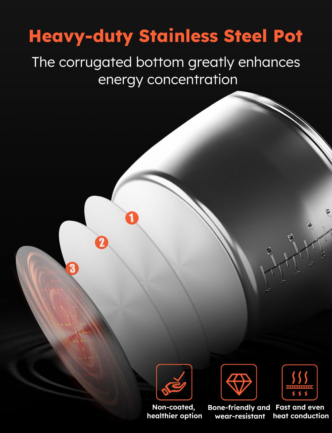 - 3-THICKER INNER POT: The pressure cooker inner pot crafted from heavy-duty 18/10 stainless steel, triple-thick, non-coated, easily withstand 6 lbs of friction for 6,000 cycles. Bone-Friendly and Wear-Resistant.