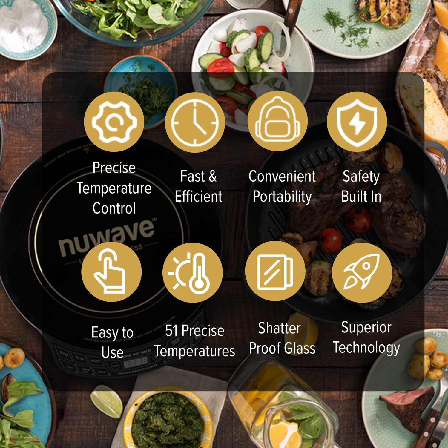 - PRECISE TEMPERATURE CONTROL – With 51 precise temperatures at your fingertips, you can keep delicate sauces warm at 100°F to grilling a juicy steak with serious grill marks at 575°F. Nuwave Induction Cooktops are the first induction cooktops to revolutionize the industry by introducing precision temperatures to induction cooking.