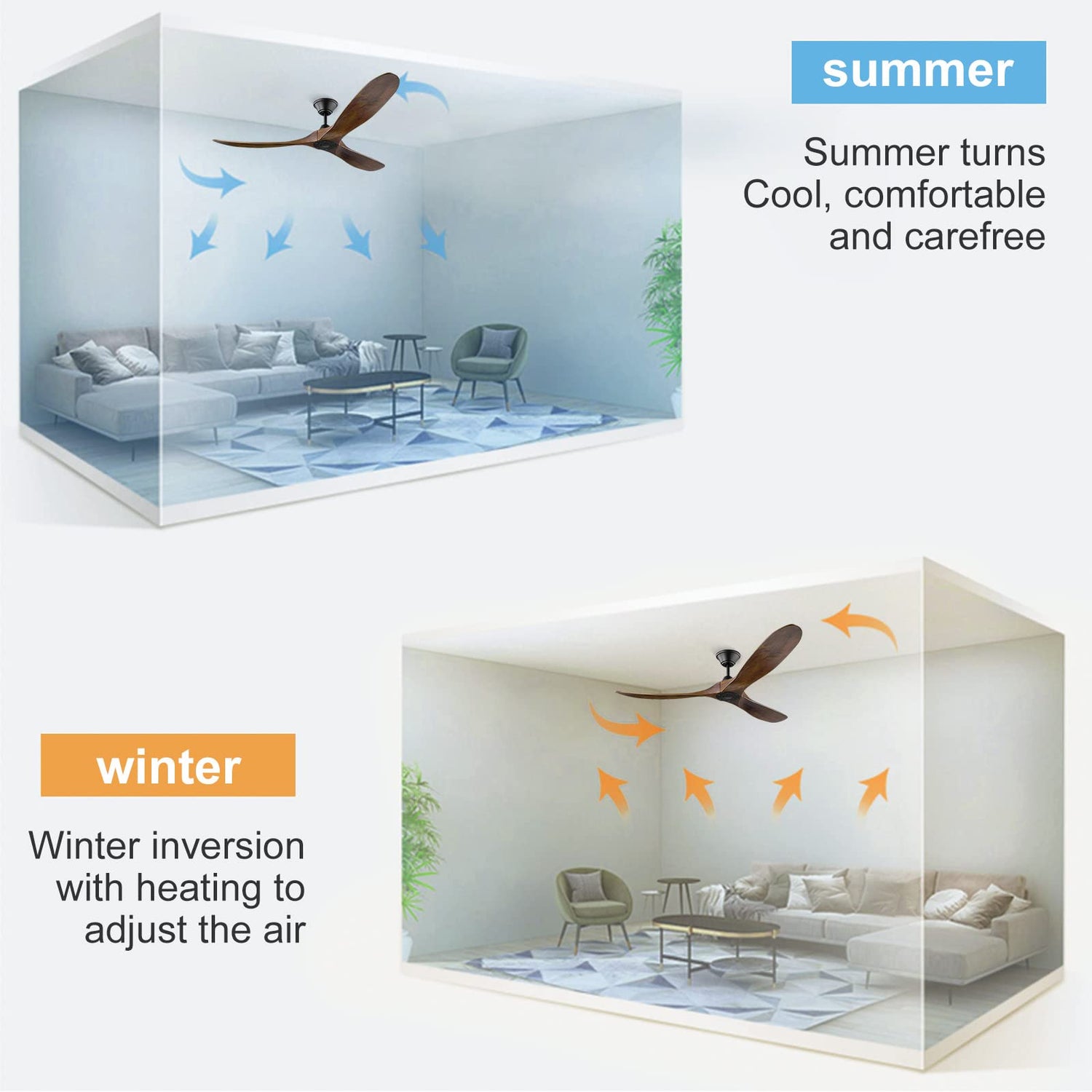 - 【70" Ceiling Fan for All Seasons】3 blade rustic ceiling fan has forward and reverse switch, allows you to change the brown ceiling fan direction seasonally. Summer, downward airflow creates a wind-cooling effect, keeping room cool. Winter, press the reverse switch, large airflow ceiling fan prevents the build-up of the warm air produced by the room's heating equipment, allow better air circulation.