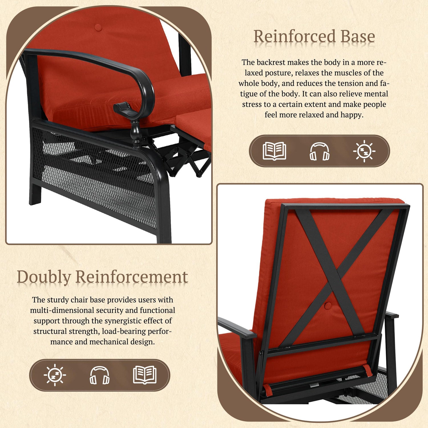 - 【Durable Material】 This outdoor relaxing chair is made of e-coated metal steel frame, which can reduce rain erosion, weather resistance, and strong enough to last.Support up to 300 lbs.