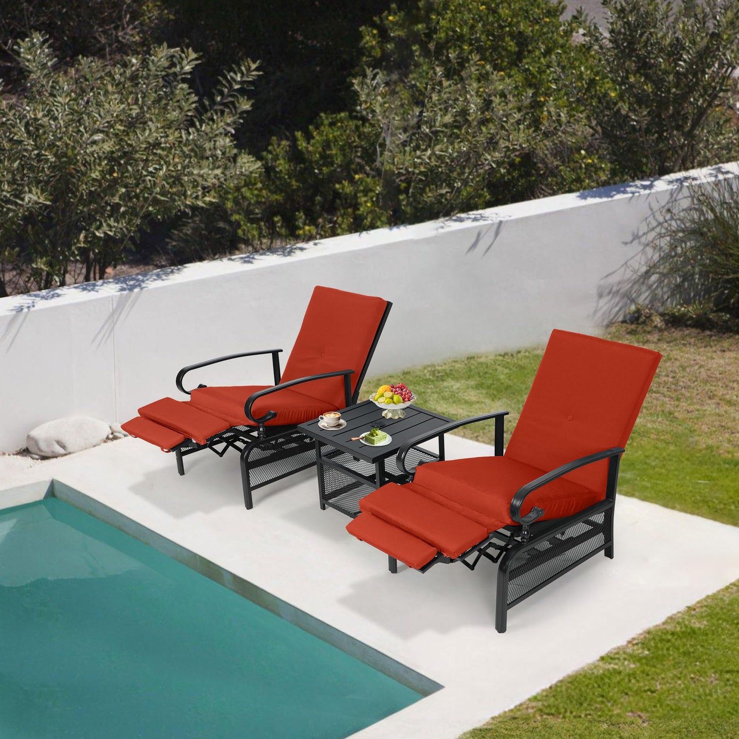 Oakcloud Adjustable Outdoor Lounge Chair Metal Patio Relaxing Recliner Chair with Removable Cushions(Red)