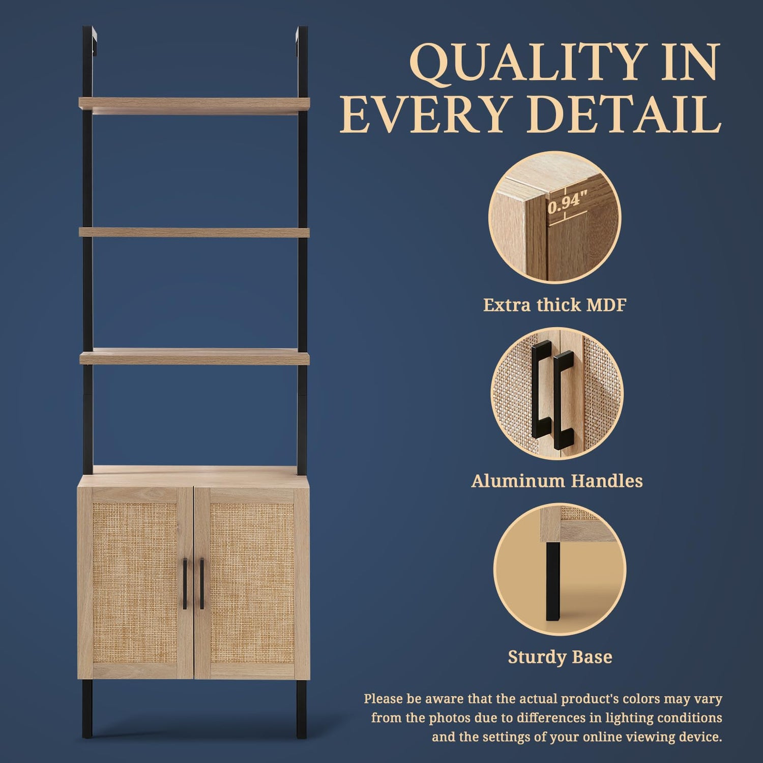 - Rattan-inspired Aesthetics: The farmhouse-inspired rattan design delicately embodies the natural beauty of the outdoors, ladder bookshelf introducing a hint of nature to your living space. The aluminum alloy handles on the rattan book shelf provide convenience when using the cabinet. Please note that the rattan patterns are crafted from plastic, offering a carefree experience