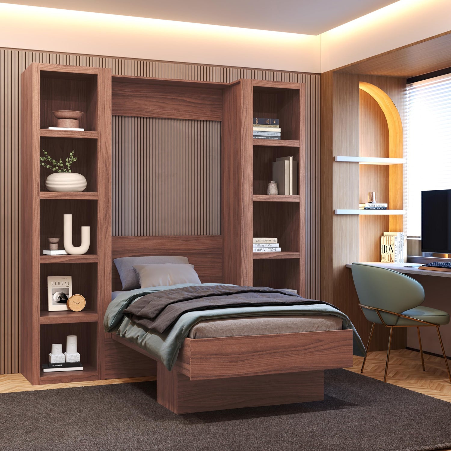 Oakland Living Easy-Lift Twin Murphy Wall Bed in Natural Brown Wood Grain with Two Bookshelves