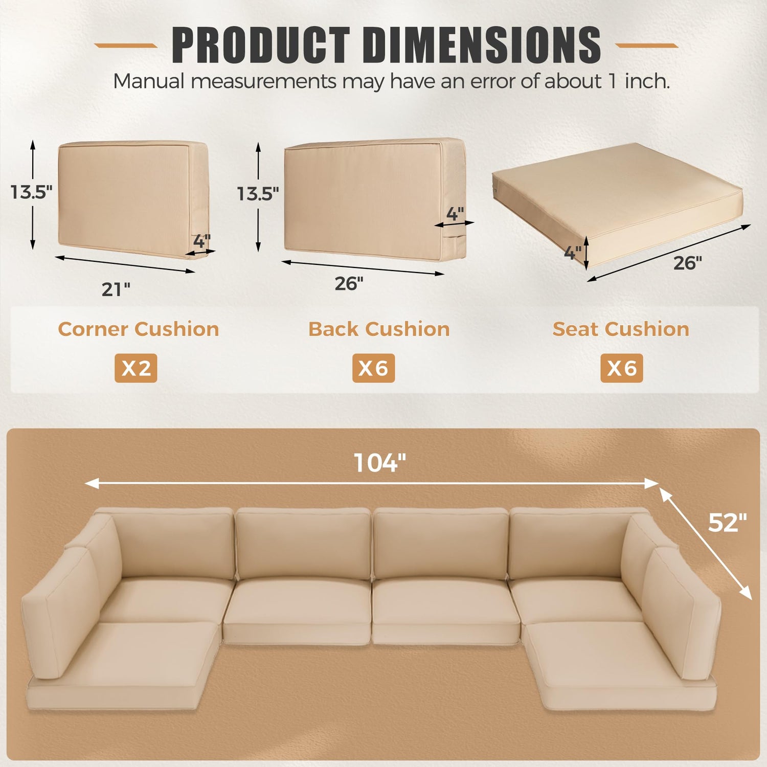 - Applicable to Many Occasions:6 seat cushions, 6 back cushions, and 2 corner cushions come in 1 box. It can be freely assembled according to usage scenarios. Perfect for outdoor furniture,patio sectional sofa.