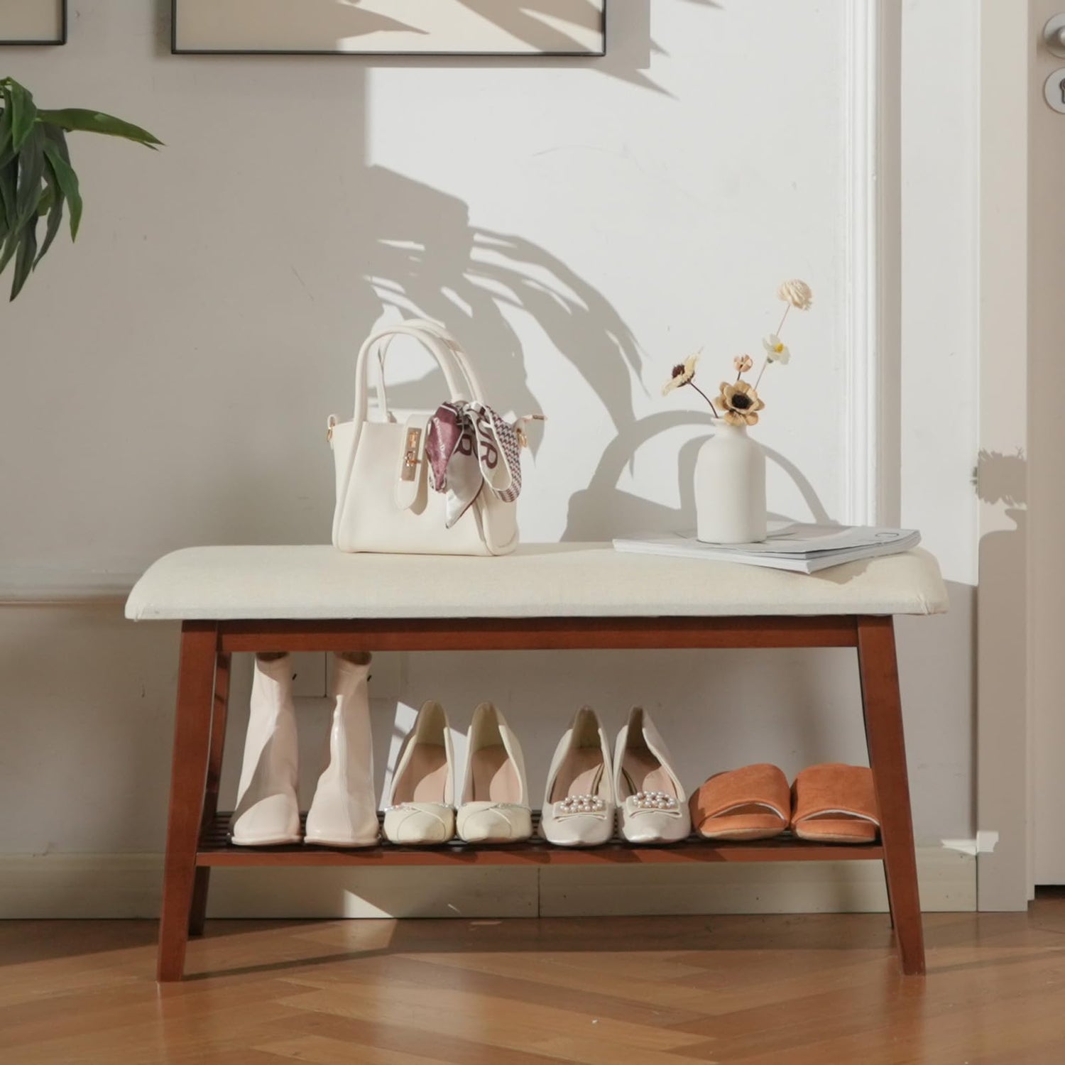 oakvivo Entryway Shoe Bench, 35.4" Bamboo Bench for Bedroom End of Bed, 2-Tier Shoe Rack with Cushion Padded Seat, Shoe Organizer Stable for Entry Hallway Living Room Bedroom, 35.4"W x11.2"D x 17.7"H