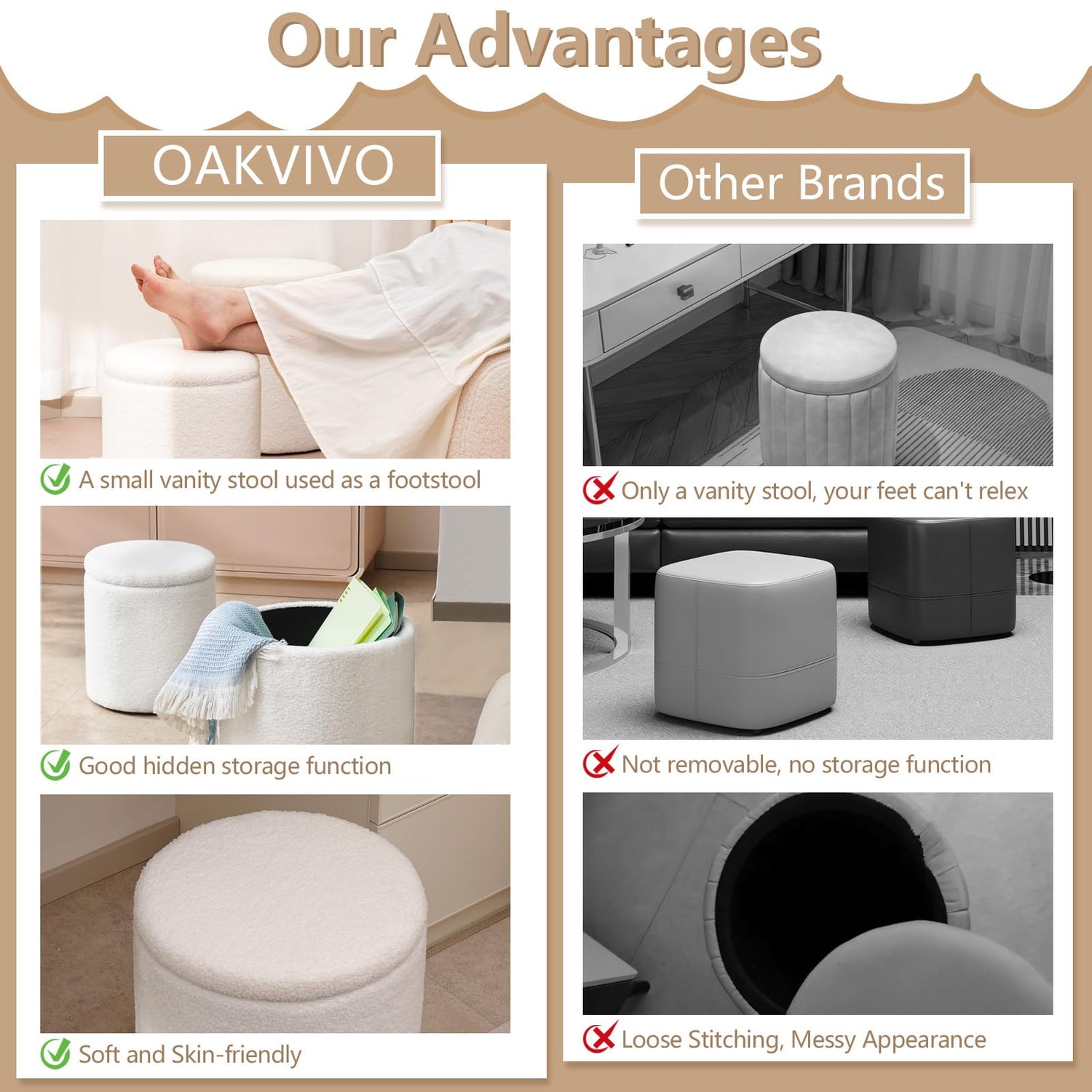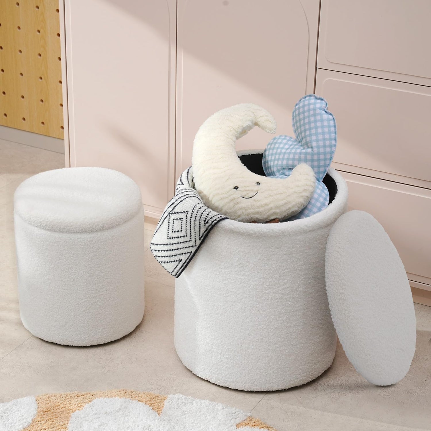 - 【Plush and Comfortable Material】: The plush round storage ottomans are covered with teddy velvet and filled with high-density sponge, making this small storage ottoman footstool extremely comfortable to sit on and a perfect companion for relaxing after a long working day.