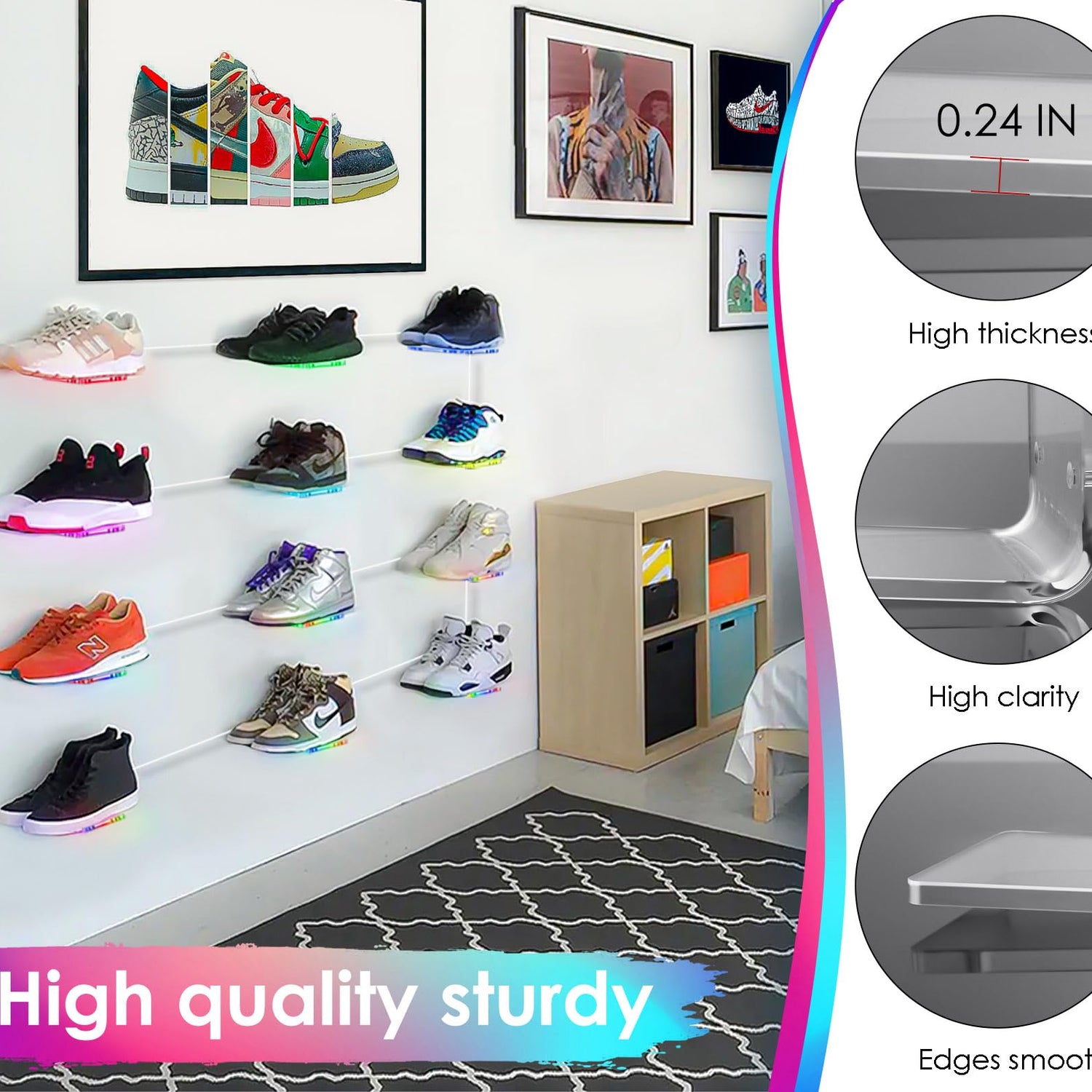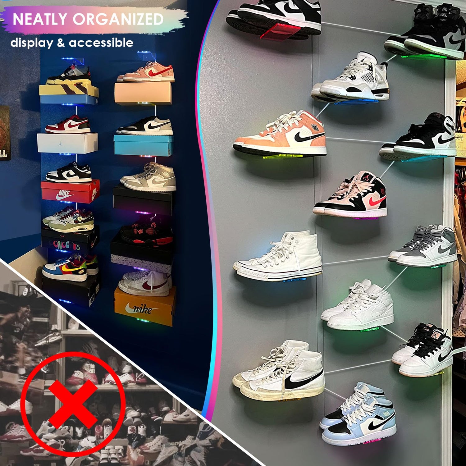 - FASHIONABLE GLOWING STORAGE DISPLAY: Transform your shoes into wall art with our transparent, suspended hanging shoe rack featuring colored lights. It optimizes wall space to organize and display your collection, keeping it tidy and within reach.
