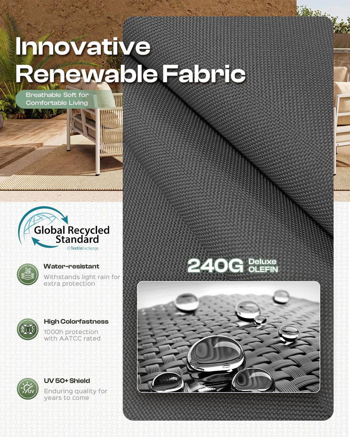 - 【Durable Design】 This modern outdoor furniture features a high-strength all-aluminum frame that is far stronger and more durable than typical metal frame. And the powder-coated surface enhances weather resistance. It embodies all the exceptional qualities that an aluminum patio furniture set should have. The Olefin fabric combines durability with UV protection for years of outdoor enjoyment. The HDPE handcrafted rope has exceptionally high strength and toughness, offering wear resistance and a longer lifespan compared to traditional wicker, setting it apart from other wicker outdoor furniture.