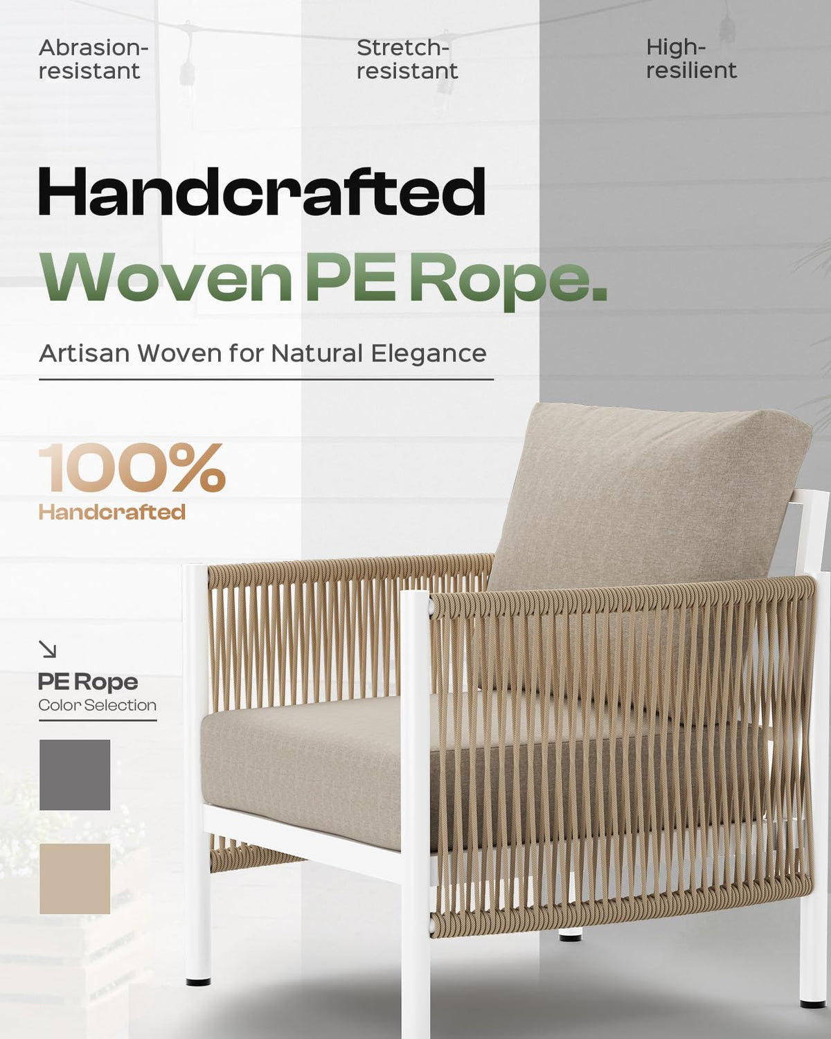 - 【Durable Design】 This modern outdoor furniture features a high-strength all-aluminum frame that is far stronger and more durable than typical metal frame. And the powder-coated surface enhances weather resistance. It embodies all the exceptional qualities that an aluminum patio furniture set should have. The Olefin fabric combines durability with UV protection for years of outdoor enjoyment. The HDPE handcrafted rope has exceptionally high strength and toughness, offering wear resistance and a longer lifespan compared to traditional wicker, setting it apart from other wicker outdoor furniture.