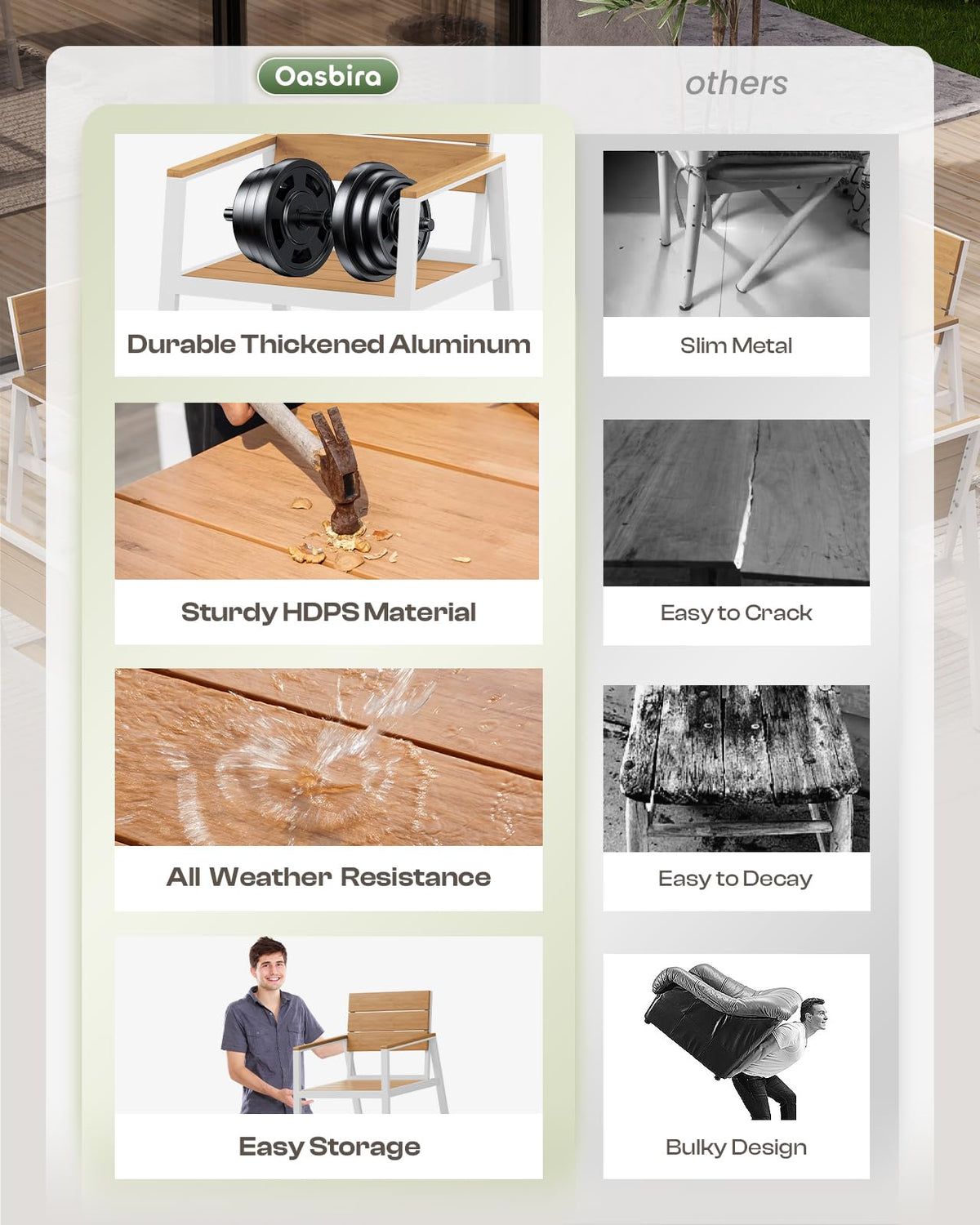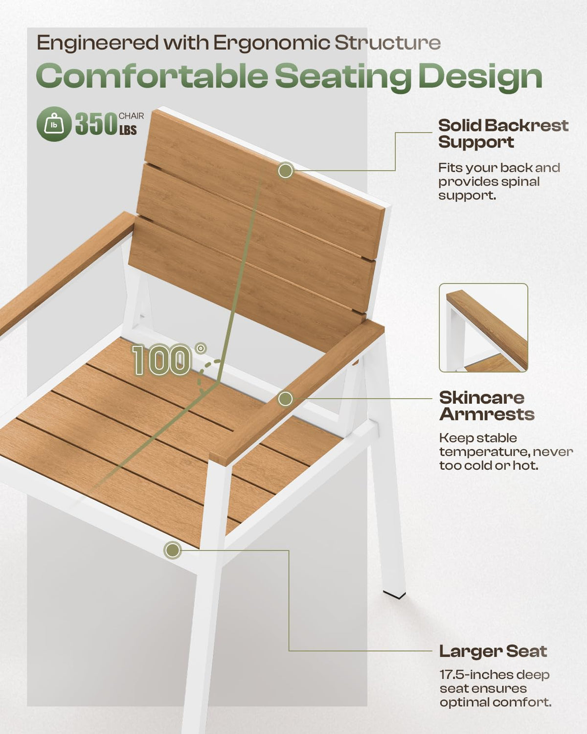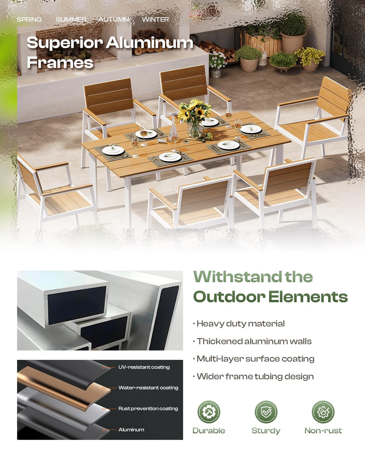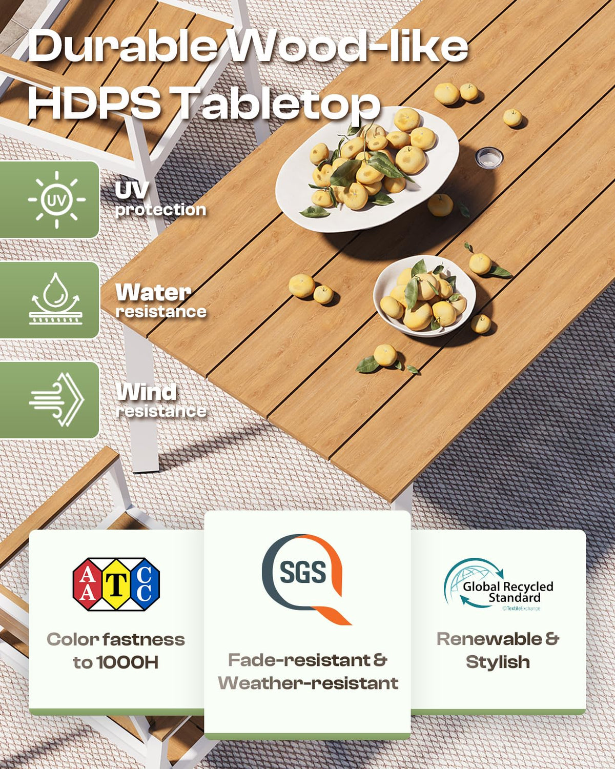 - Premium Material: This outdoor table and chairs set is crafted with high-quality aluminum frame and HDPS material. The aluminum frame features a double-layer design, engineered for exceptional stability and load-bearing capacity. The HDPS tabletop offers a natural wood-like finish, combining elegance with durability and weather resistance
