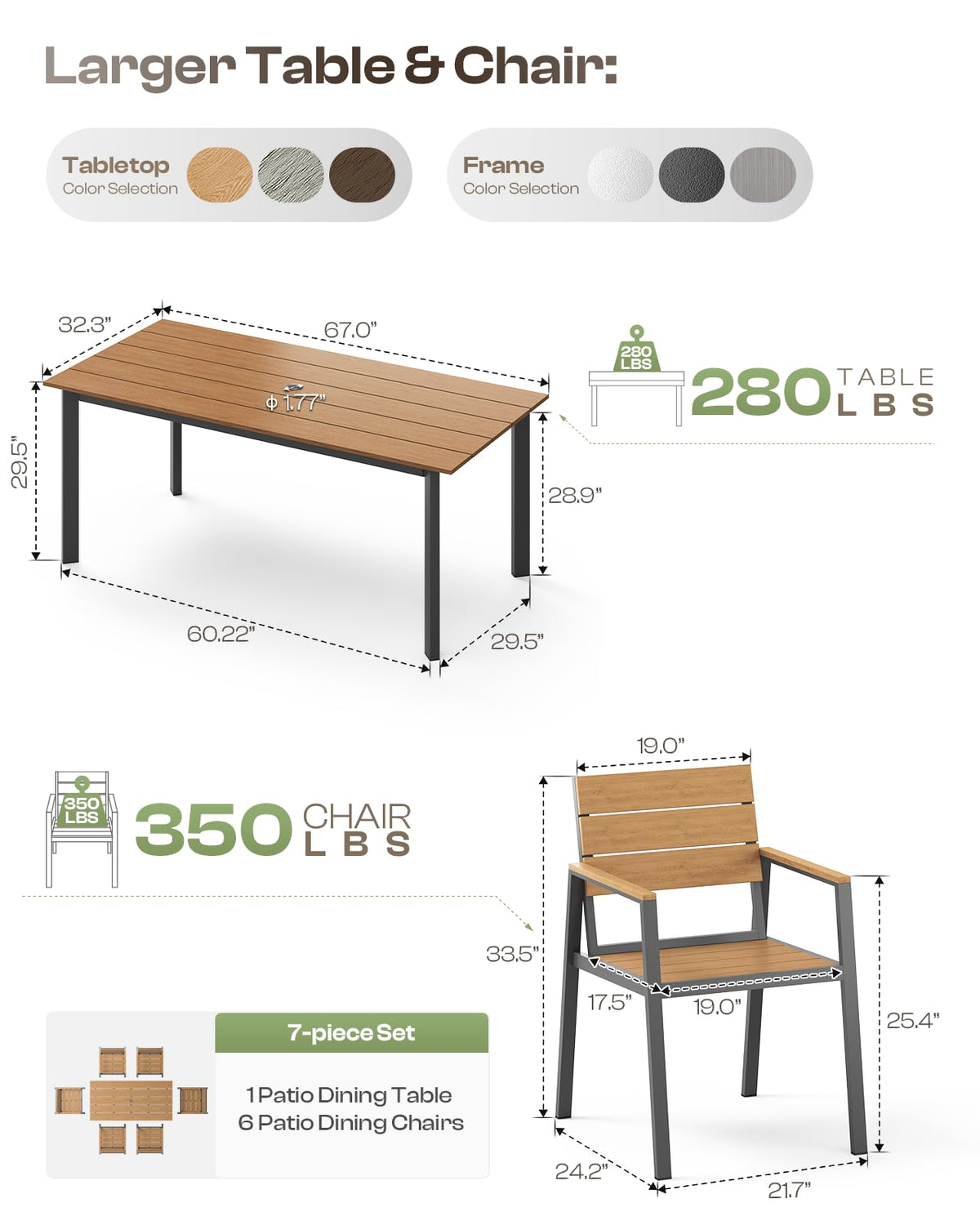 - Spacious & Comfortable Dining Set: The patio dining table features a 1.77" umbrella hole, perfect for sunny or rainy days. Measuring 66.9" L x 32.3" W x 29.5" H, it offers ample space for meals or games and supports up to 280 lbs. The dining chairs (21.7" L x 24.2" W x 33.5" H) are built to withstand up to 350 lbs, ensuring a sturdy and comfortable seating experience for all