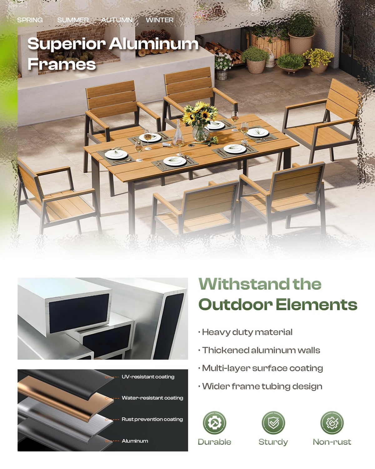 - Premium Material: This outdoor table and chairs set is crafted with high-quality aluminum frame and HDPS material. The aluminum frame features a double-layer design, engineered for exceptional stability and load-bearing capacity. The HDPS tabletop offers a natural wood-like finish, combining elegance with durability and weather resistance