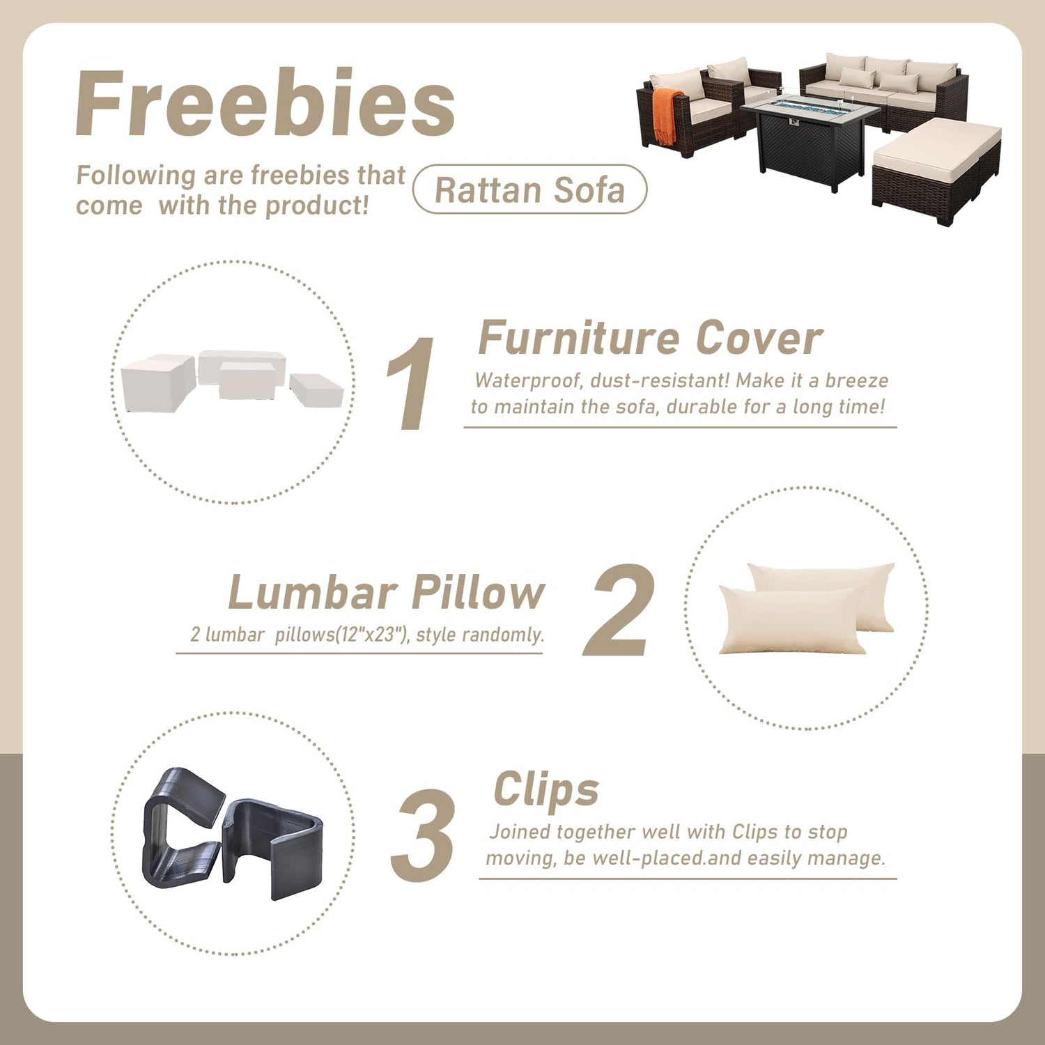 Oasishine 6 Pieces Outdoor Furniture 60000BTU Outdoor Propane Fire Pit Wicker Patio Furniture Set 45" Steel Fire Table Anti-Slip Cushions Waterproof Covers, Khaki