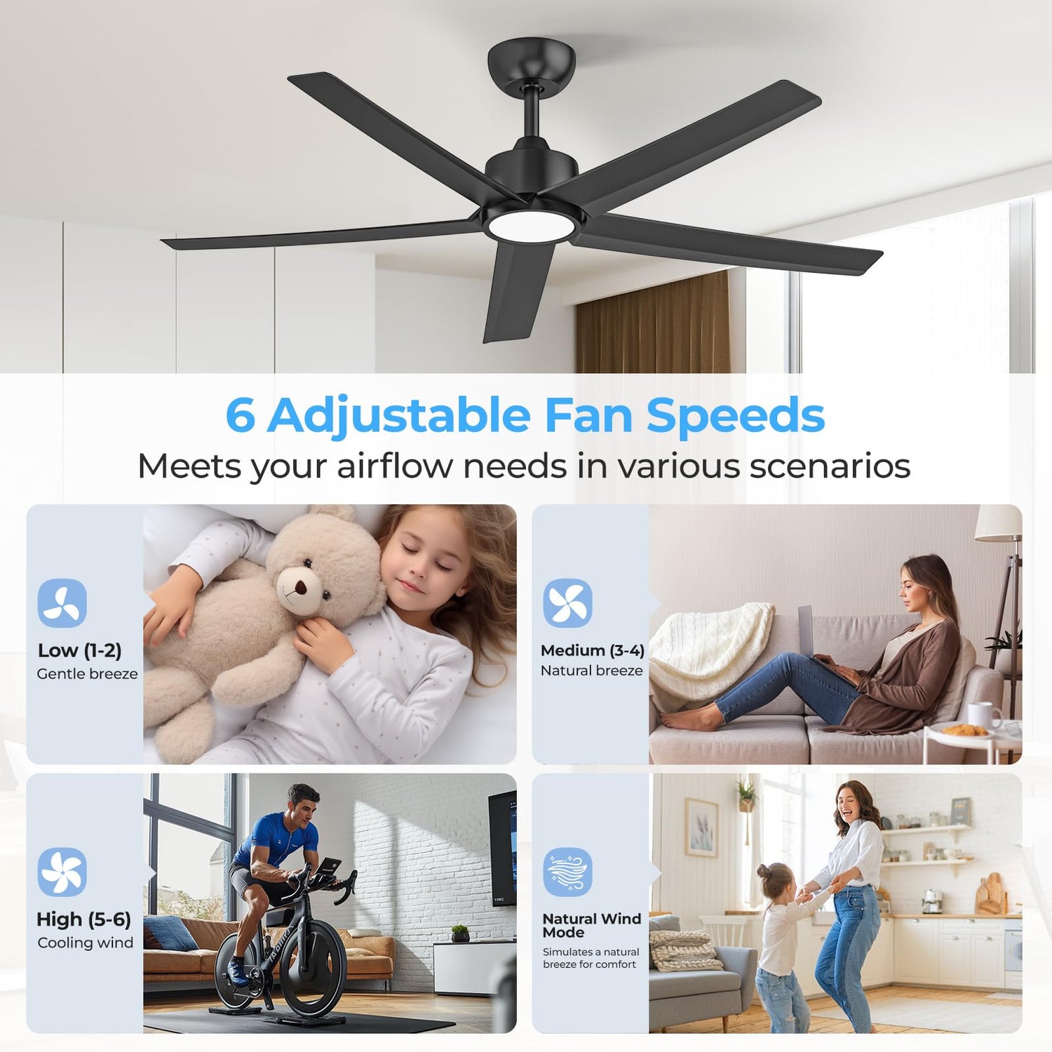 - Powerful & Quiet DC Motor: Crafted with 30W powerful DC motor (airflow up to 6025 CFM) and 5 high-strength ABS blades, this black ceiling fan offers exceptional durability, warp resistance, and easy maintenance; The lightweight integrated blade design enhances airflow efficiency; The 52-inch ceiling fan is an excellent choice for medium-sized spaces, such as bedrooms, home offices, dining areas, and covered patios