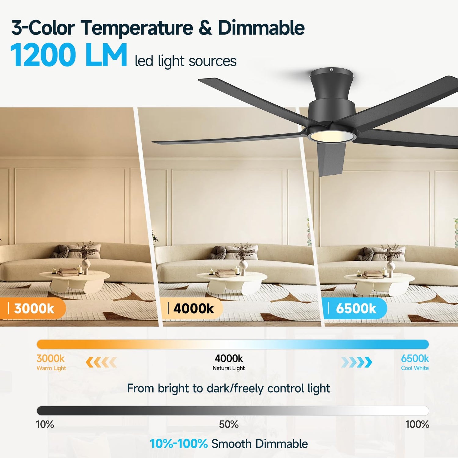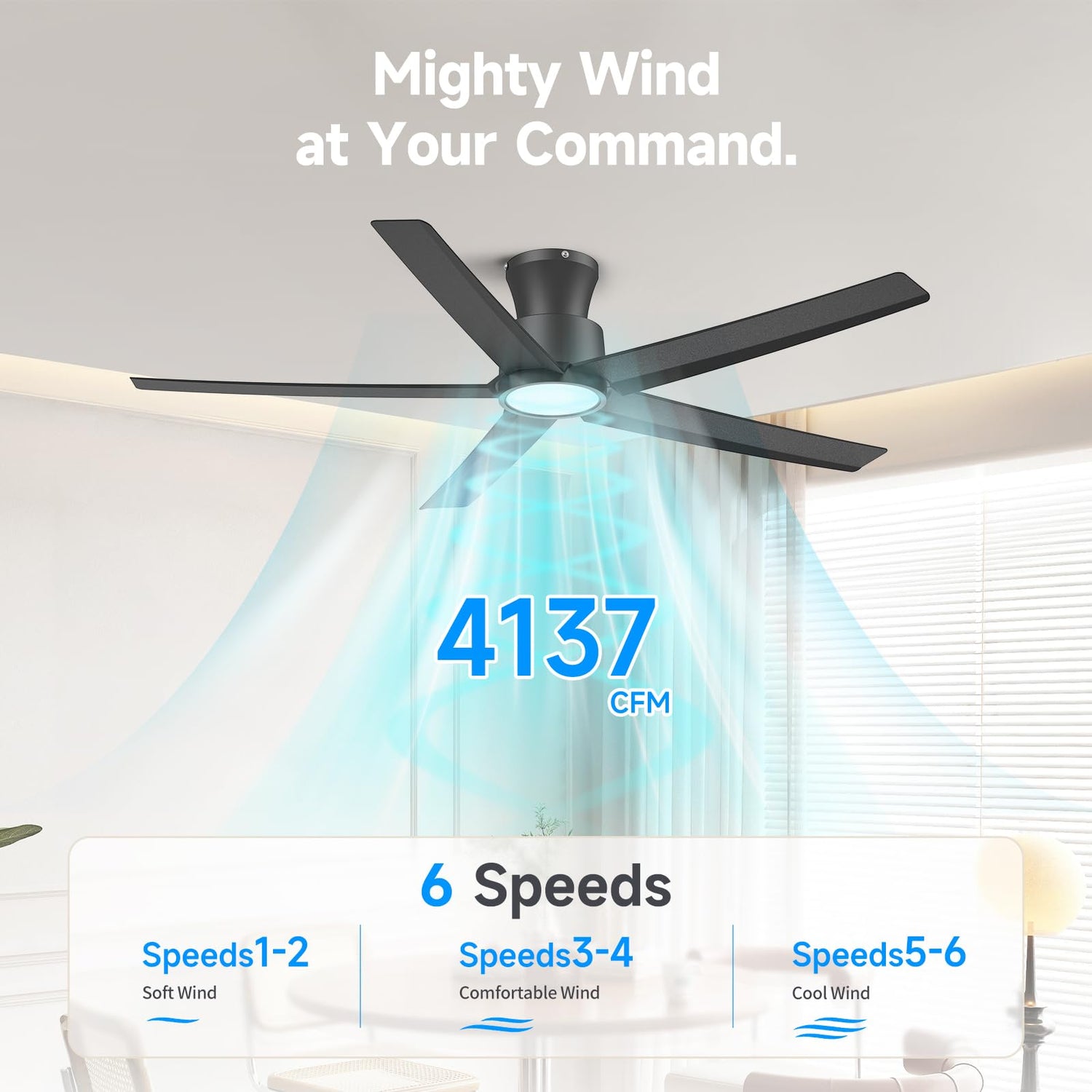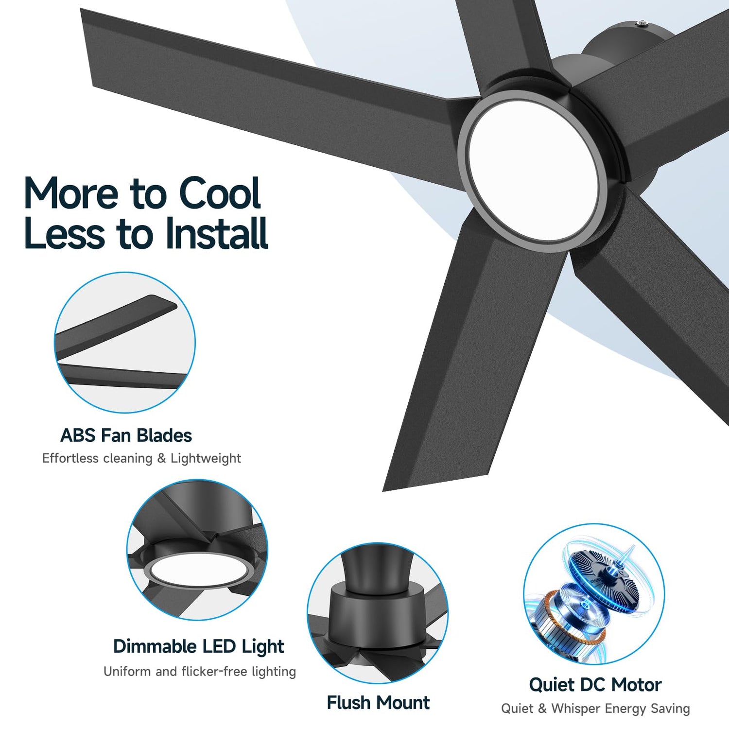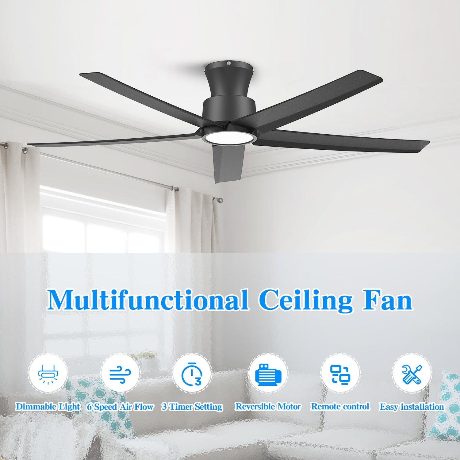 - Modern Design & Powerful 5-Blade Airflow: This ceiling fan seamlessly blends modern minimalist design with powerful airflow , perfect for spaces with low ceilings. The led ceiling fan features high-quality ABS black plastic blades for a sleek, contemporary look and employs 5-blade technology to ensure superior ventilation, with a maximum airflow of up to 5600 CFM. Ideal for bedrooms, living rooms, and other indoor areas, this modern ceiling fan adds a stylish, upscale touch to your home.