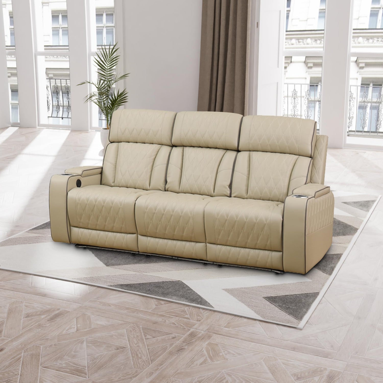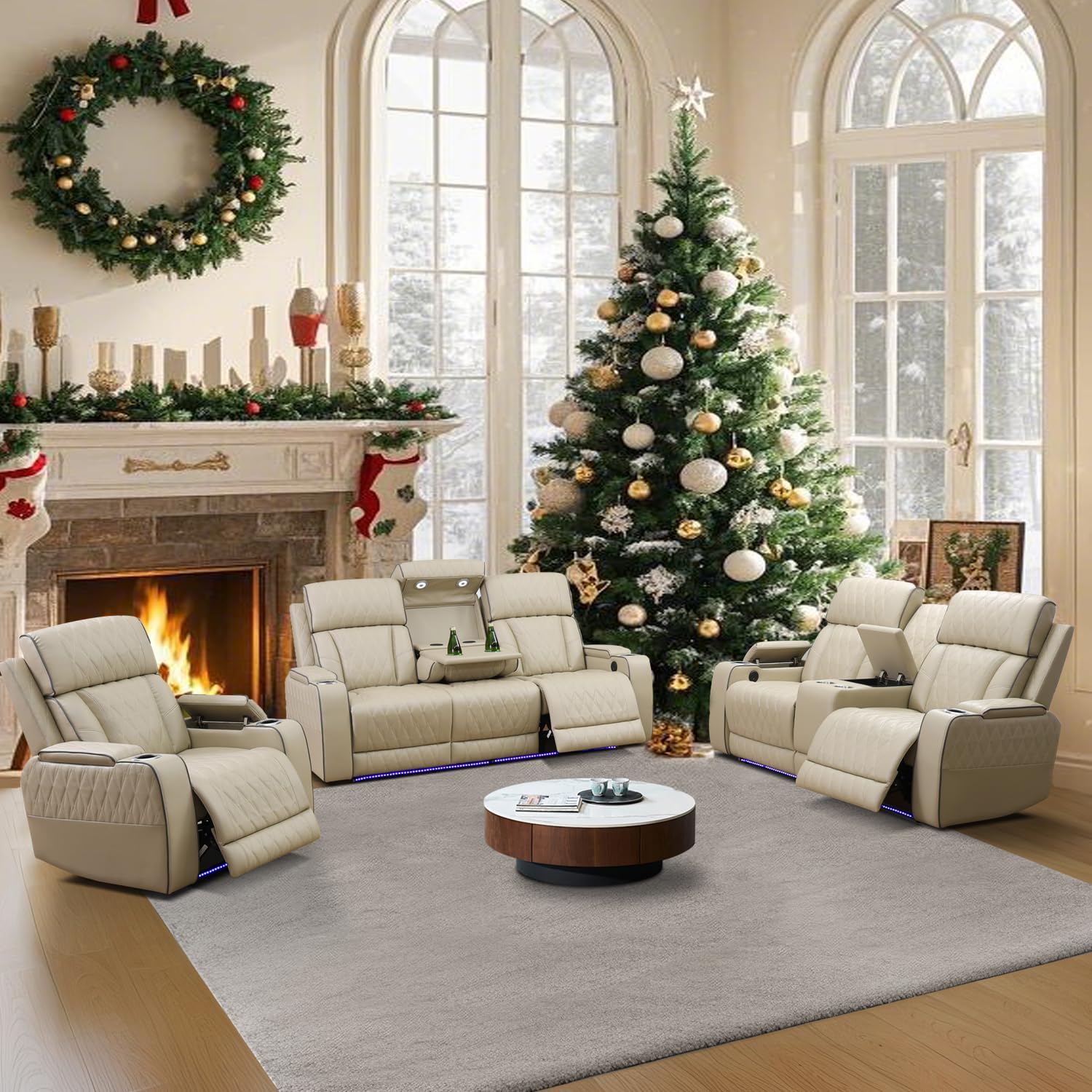 Ocstta Power Recliner Sofa Set with LED, Breathing Leather Living Room Furniture, Leather Couches Reclining Sofa with Cup Holders/Storage/USB Ports (3 Piece Living Room Set, Khaki)