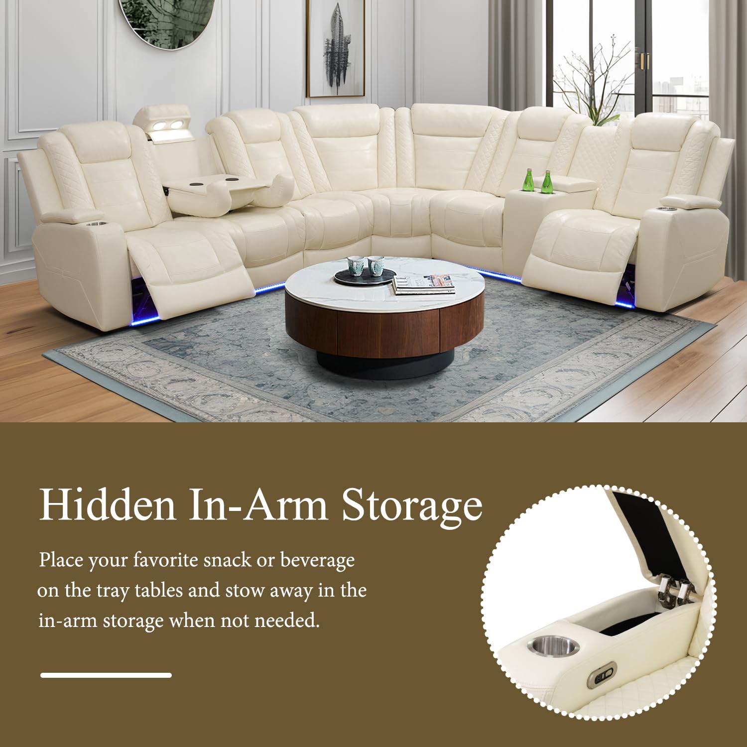 Ocstta Power Reclining Sectional Sofa Breathing Leather Sectional with Recliner, LED Light, Cup Holders and Storage 6 Seats L Shaped Recliner Couch for Home Theater Seating (Cream White)