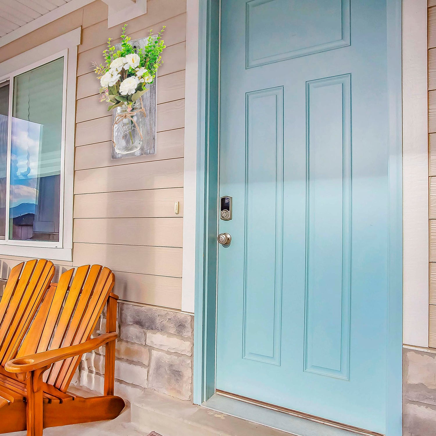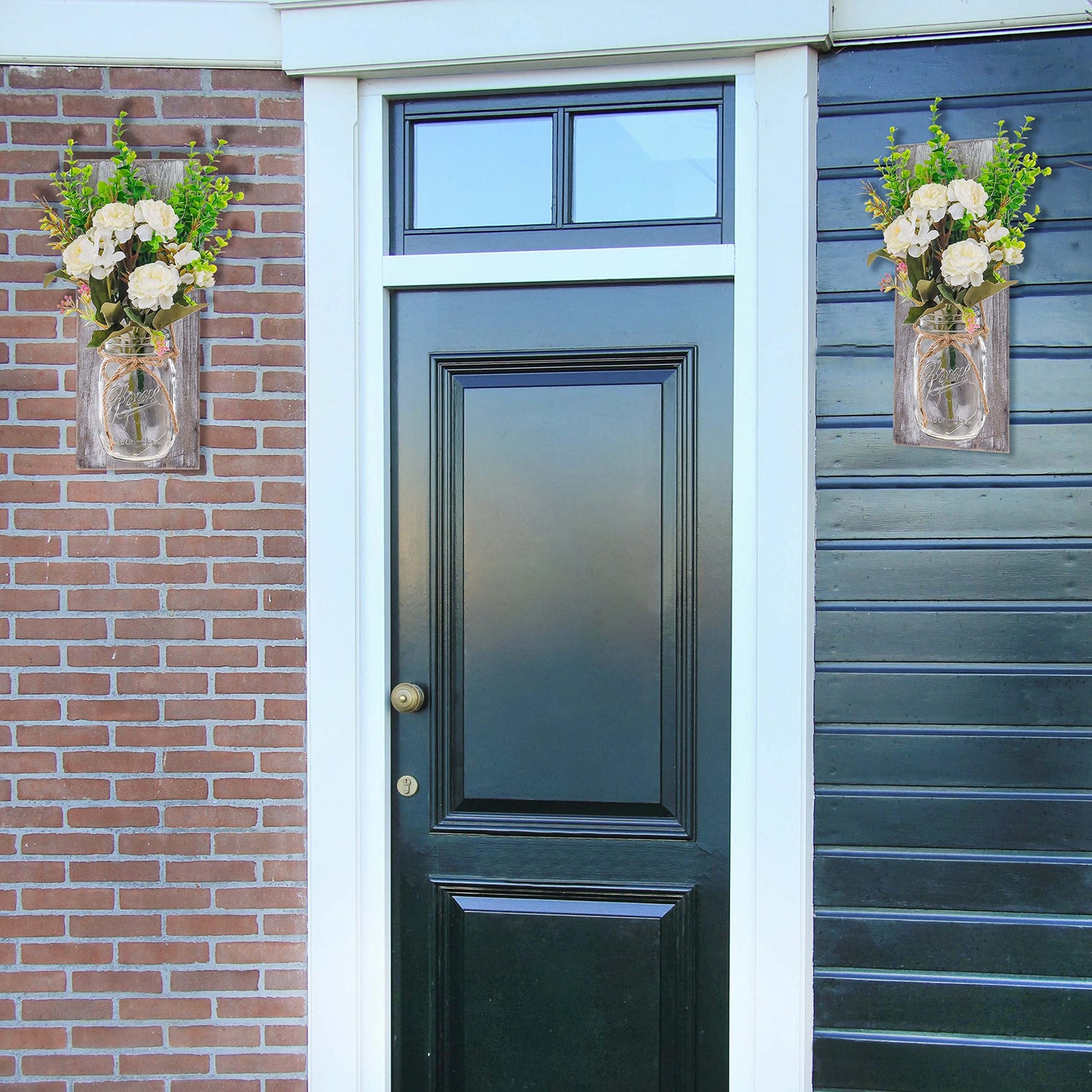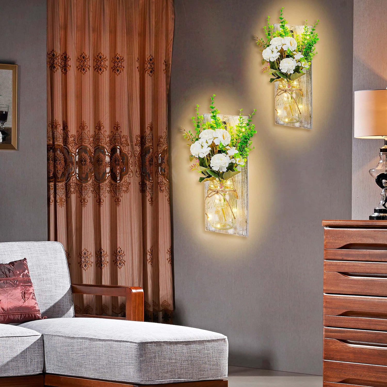 - ❸ Handmade with polished finished, 2 mason jars, 2 grey wood board, 2 strips of LED 20-lights ( batteries not included), 2 white peony,2 eucalyptus leaves, 2 Seamless Nail and 2 remote controls ( 8 kinds of light modes with 6-Hour Smart Timer)