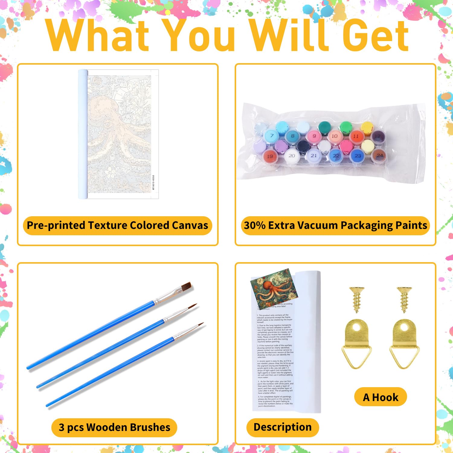 - 【What Will You Get ?】 Our octopus paint by numbers kit for adults comes with everything you need to begin: 1x waterproof canvas, 1x matching paint, 3x nylon brushes (different sizes), 1x line drawing, 1x instruction manual, 1x finished effect card, 2x metal hooks.(No frame)