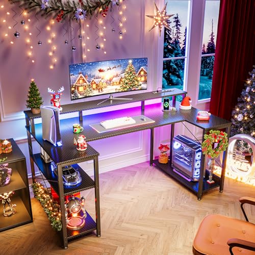 ODK 48 Inch Gaming Desk with LED Lights and Power Outlet, U-Shaped Computer Desk with Monitor Stand and Storage Shelves, PC Gamer Table for Home Office, Carbon Fiber Black