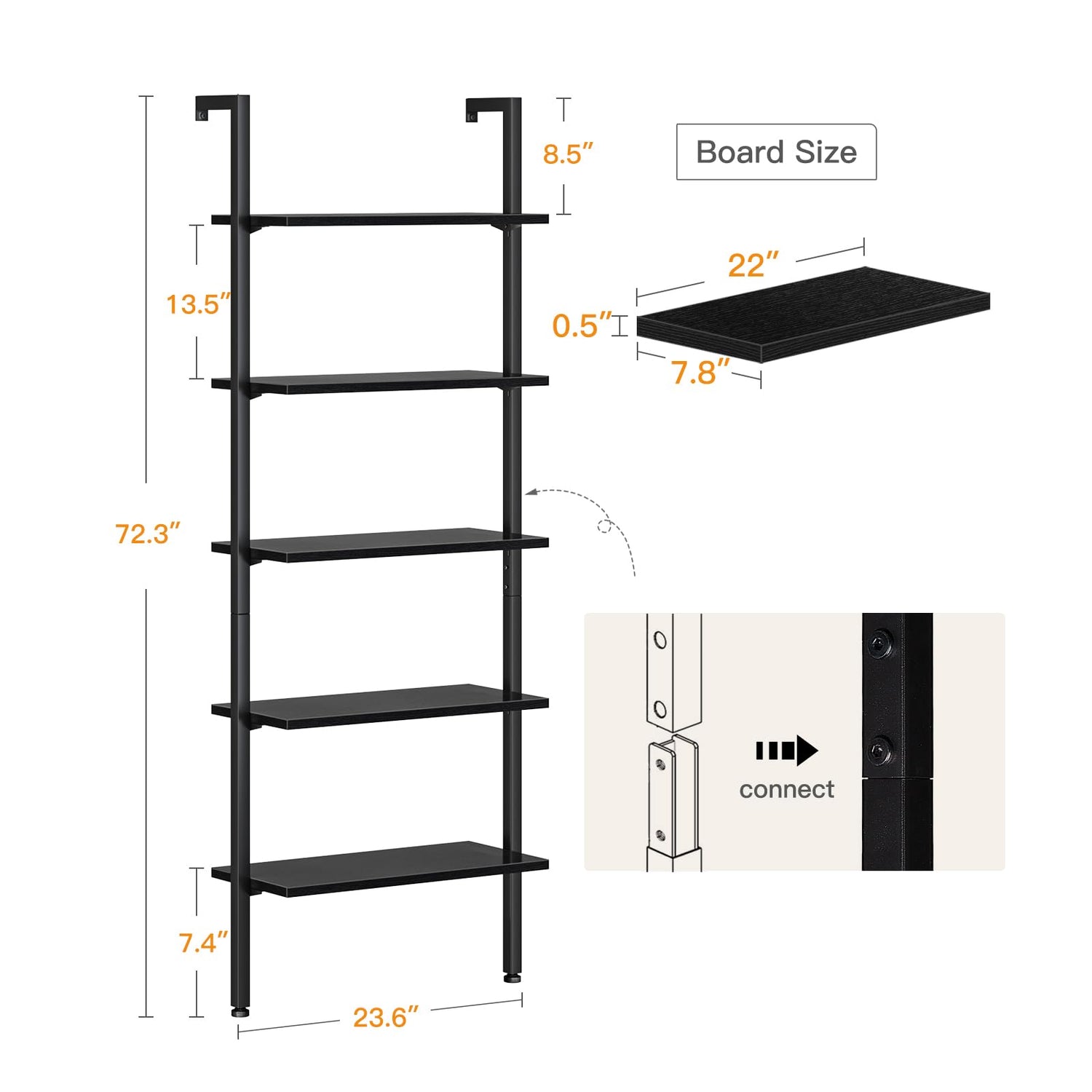 - CLASSIC & INDUSTRIAL STYLE: The whole style of this 5-shelf ladder bookcase is very simple and classic. Complete your home or office decor/storage with this wall-mounted industrial bookshelf - artfully combining black board and chic black steel, bringing your space a fresh feeling.