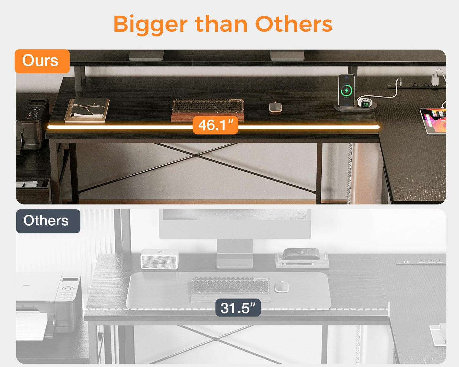 ODK 75" Reversible L Shaped Desk with LED Lighting, Power Outlet, and Ample Storage Solutions in Black
