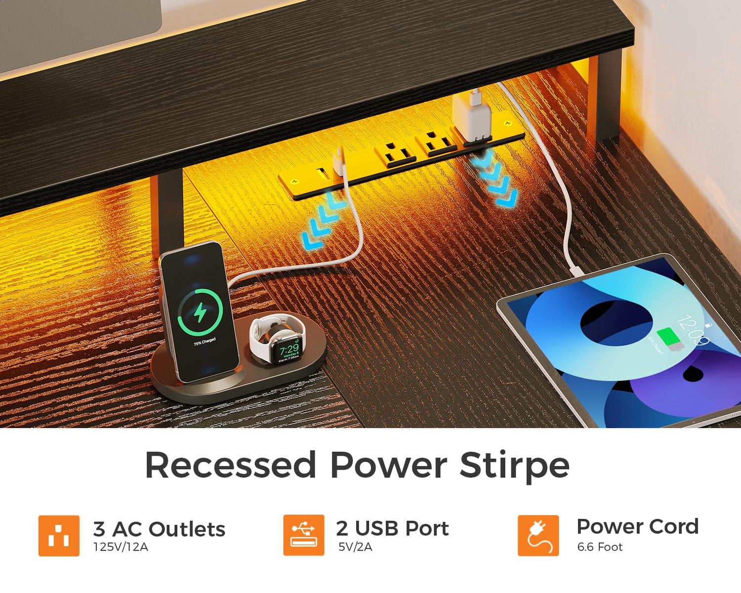 This desk is designed with convenience in mind. Equipped with a power outlet featuring three standard plug sockets and two USB ports, it allows for easy charging of your laptop, phone, and gaming devices right where you need them. The extended monitor stand not only offers ergonomic benefits by protecting your neck and spine but also maximises your desktop space for added functionality.