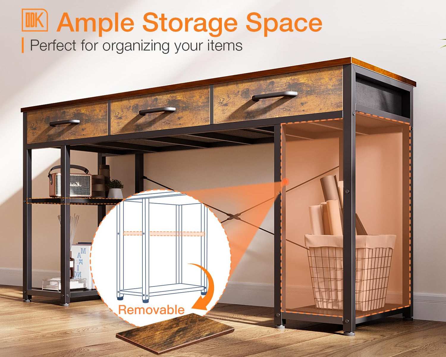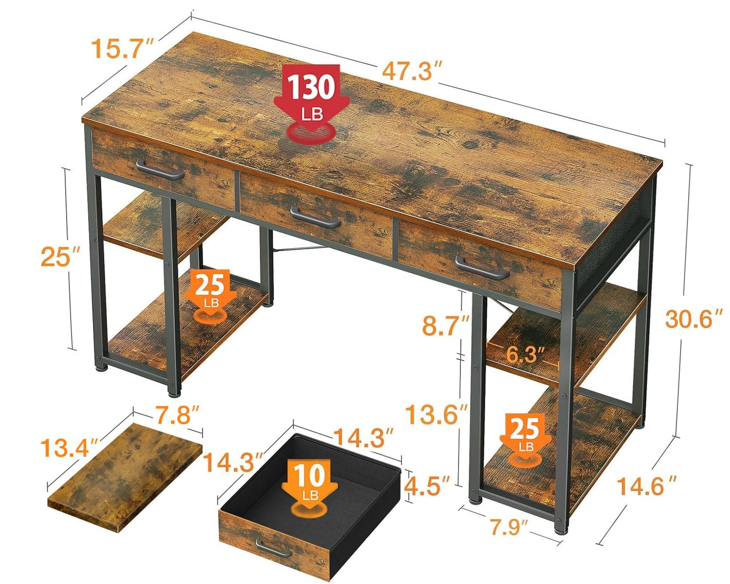 Equipped with detachable storage shelves, this versatile computer desk provides ample space to display books or organise your essentials. You have the flexibility to customise the configuration to suit your needs, whether for work or study. The spacious desktop is perfectly sized to accommodate your laptop and other materials, while the three large-capacity drawers can support up to 8 lb each, catering to all your office requirements.