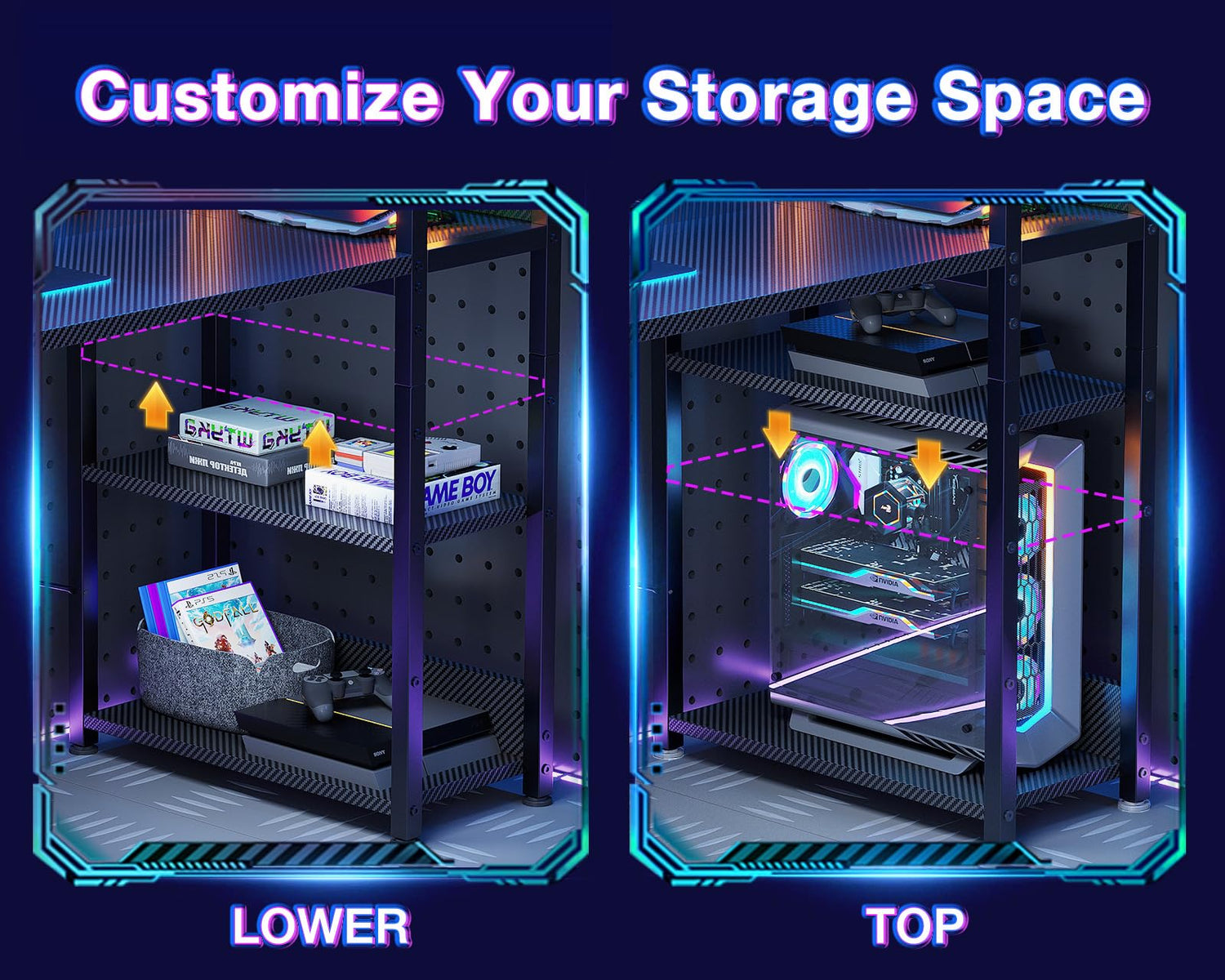 - 【Gaming Desk with Colorful LED Lights】This gaming table features LED strip that contains 10 static colors, 6 brightness grades, 10 dynamic modes and memory function with switching controls. Adjusting to the proper lighting can reduce eye strain, improve focus, and create a comfortable workspace/gaming space.