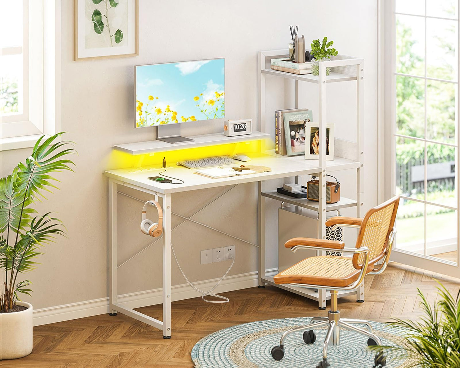 ODK Reversible Gaming Desk with USB Charging Port and LED Lights, 40 Inch Computer Desk with Storage Shelves & Monitor Stand, Writing Study Table for Home Office, Small Space Bedroom, White