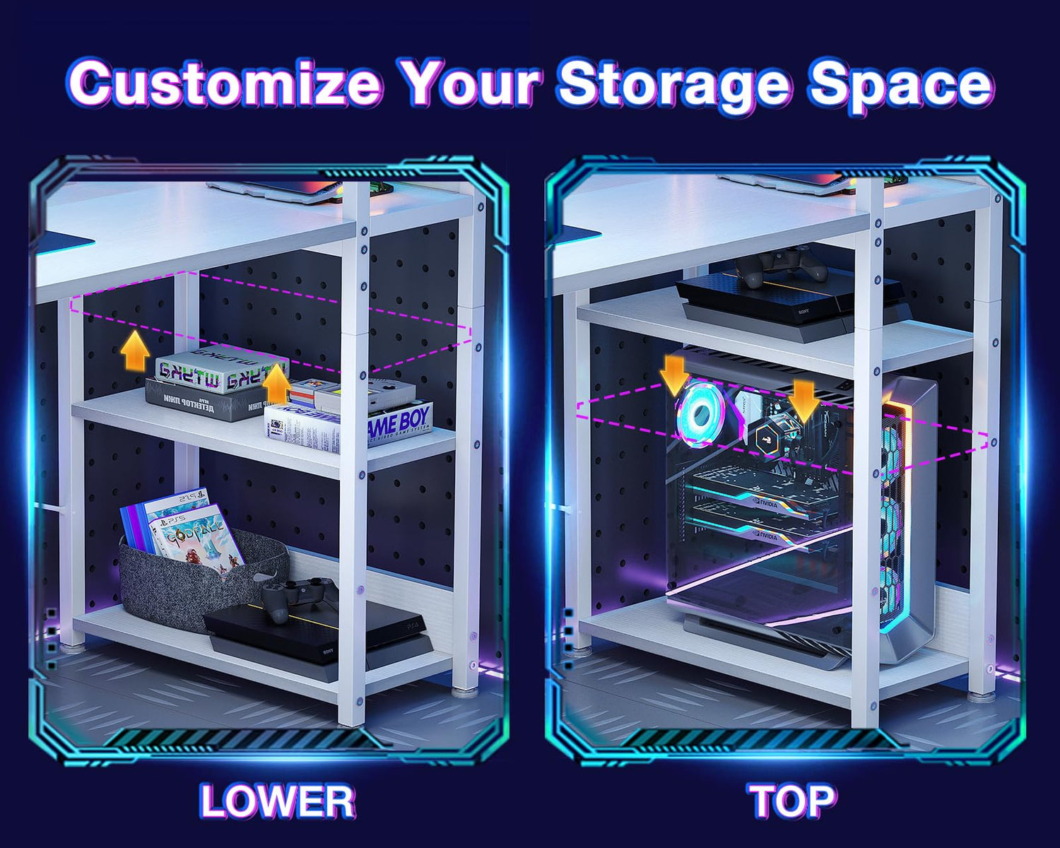 - 【Gaming Desk with Colorful LED Lights】This gaming table features LED strip that contains 10 static colors, 6 brightness grades, 10 dynamic modes and memory function with switching controls. Adjusting to the proper lighting can reduce eye strain, improve focus, and create a comfortable workspace/gaming space.